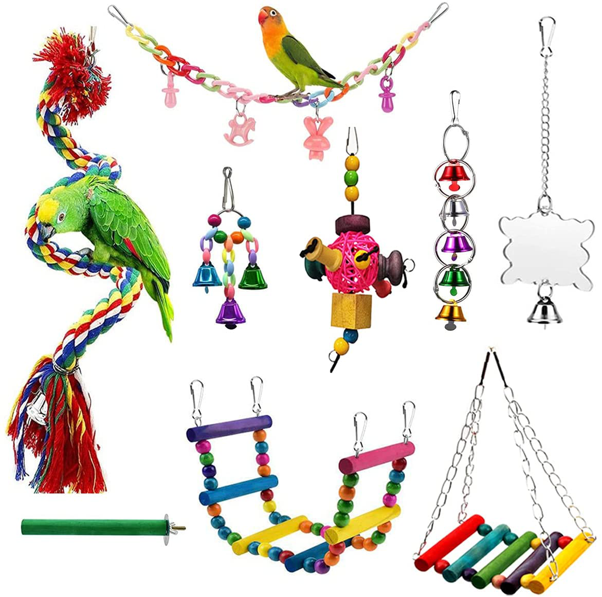 - 【Complete Birdcage Accessories】: This birdcage toy consists of 10 pieces, bird ladders swing toy, bird hanging swing toy,parrot fun swing, parrot carousel rope, parrot frosted station stick, parrot 3 bell strings, parrot 5 bell strings, parrot chewing ball string,parrot mirror