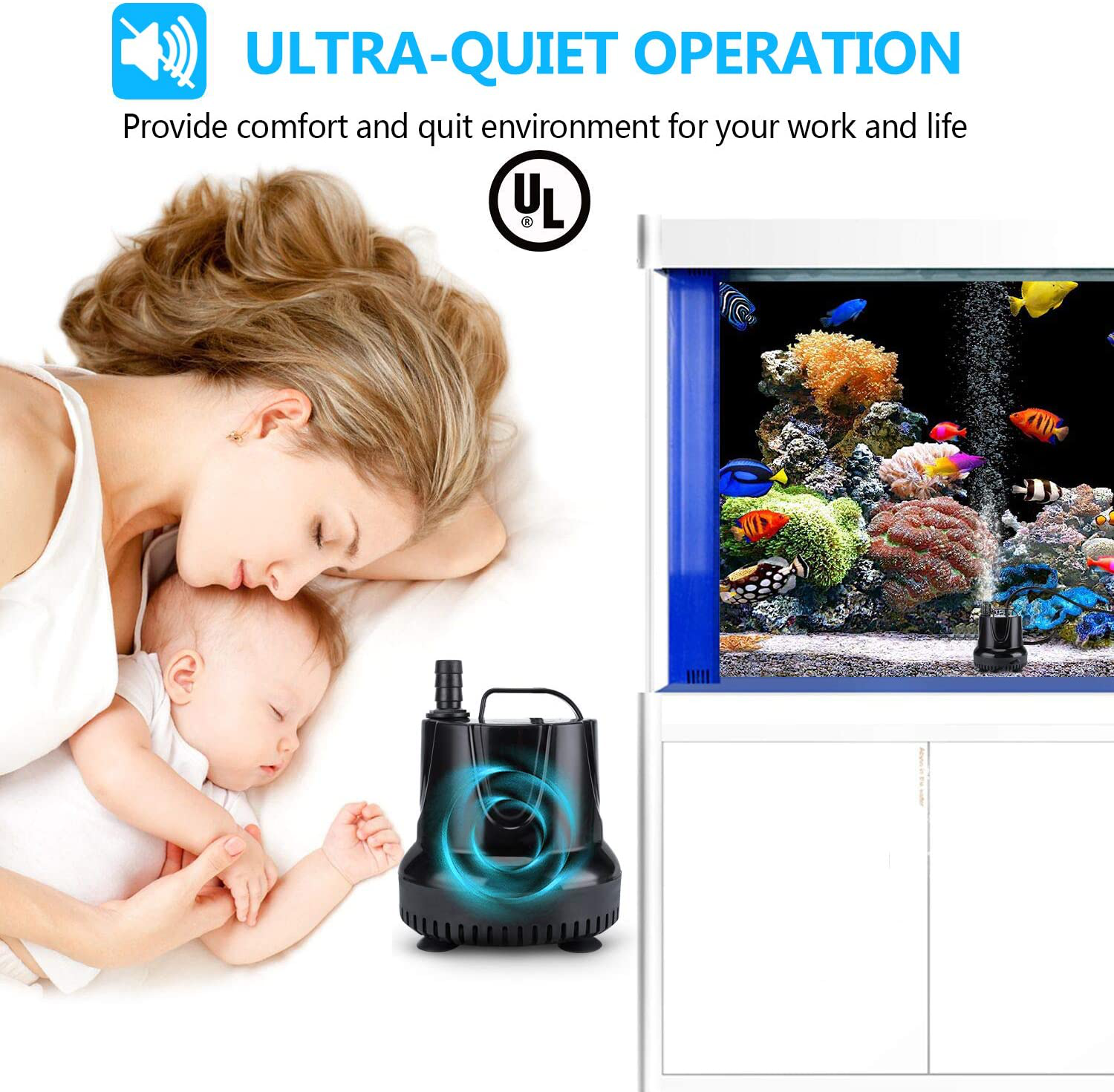 - ★【MULTI-OCCASIONS】The fountain pump can make circulation to your tank and give your lovely fish a near-natural environment. This submersible water pump can create water current, ideal for a medium-sized aquarium, small pond, water garden, and desktop water fountains. Perfect for backyard fountain/waterfall, aquarium, ponds, fish tank, tabletop fountains, garden statuary, patio drip irrigation system and hydroponic systems and more.