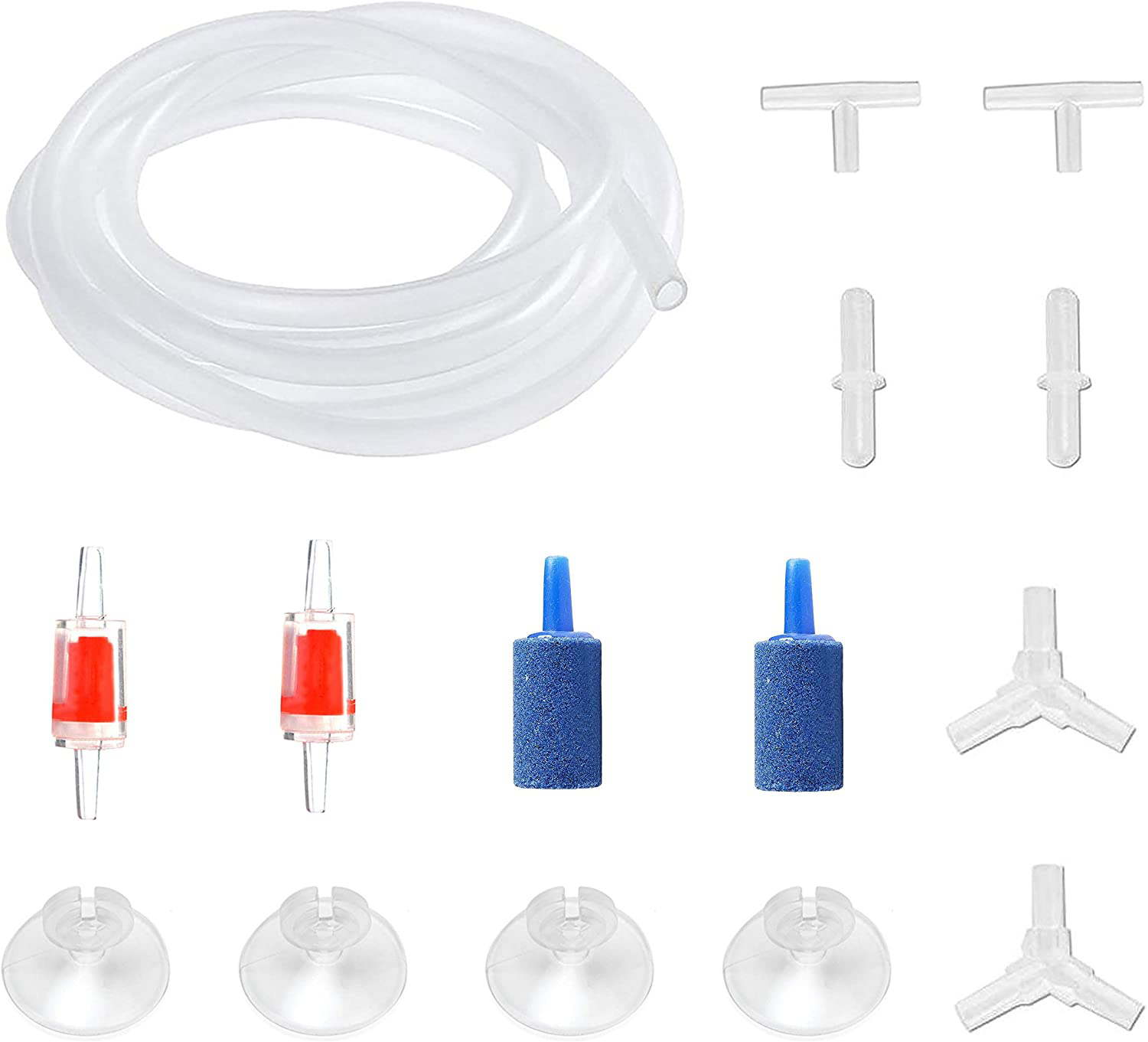 - The air pump accessories set included 1pc 80inch airline tubing, 2 air stone, 2 check valves, 2 I-connector, 2 T-connector, 2 Y-connector, and 4 suction cups, 15pcs in total.