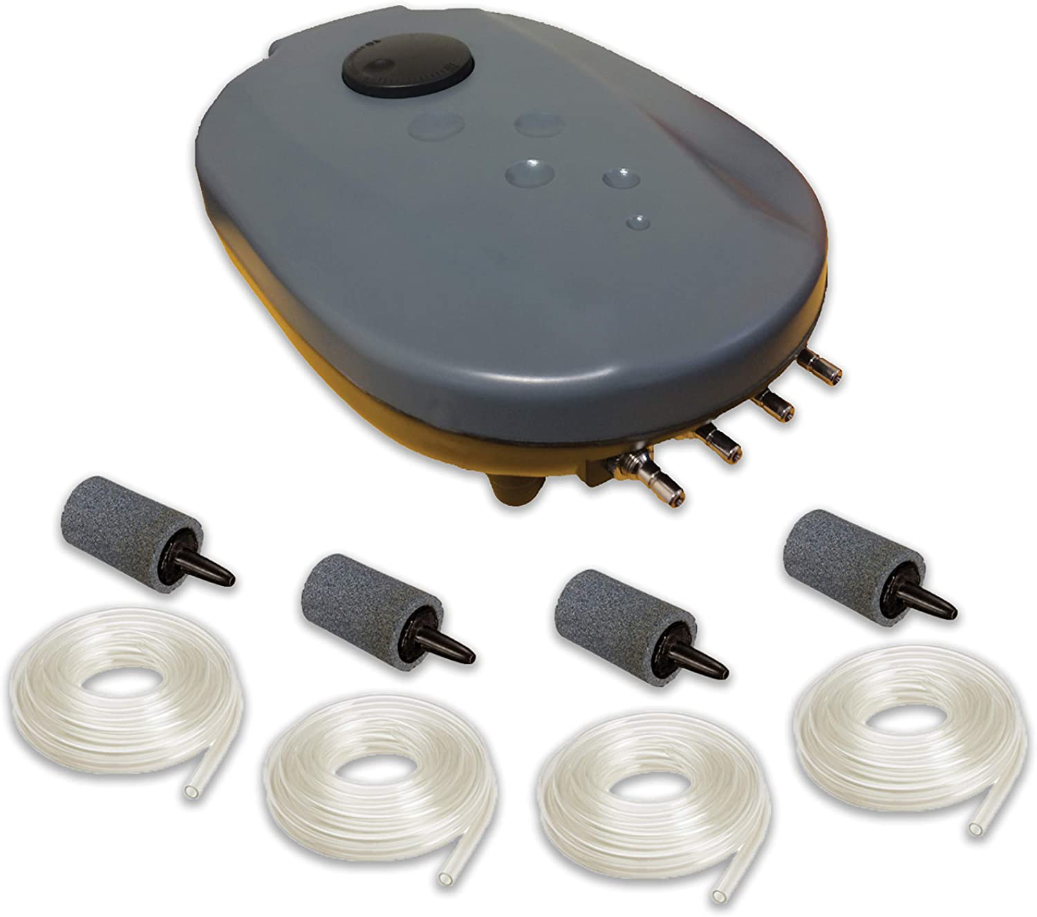 - Includes: Air Pump with 4 Integrated Outlets, (4) 30’ Clear Vinyl Tubing, (4) Air Stone.
