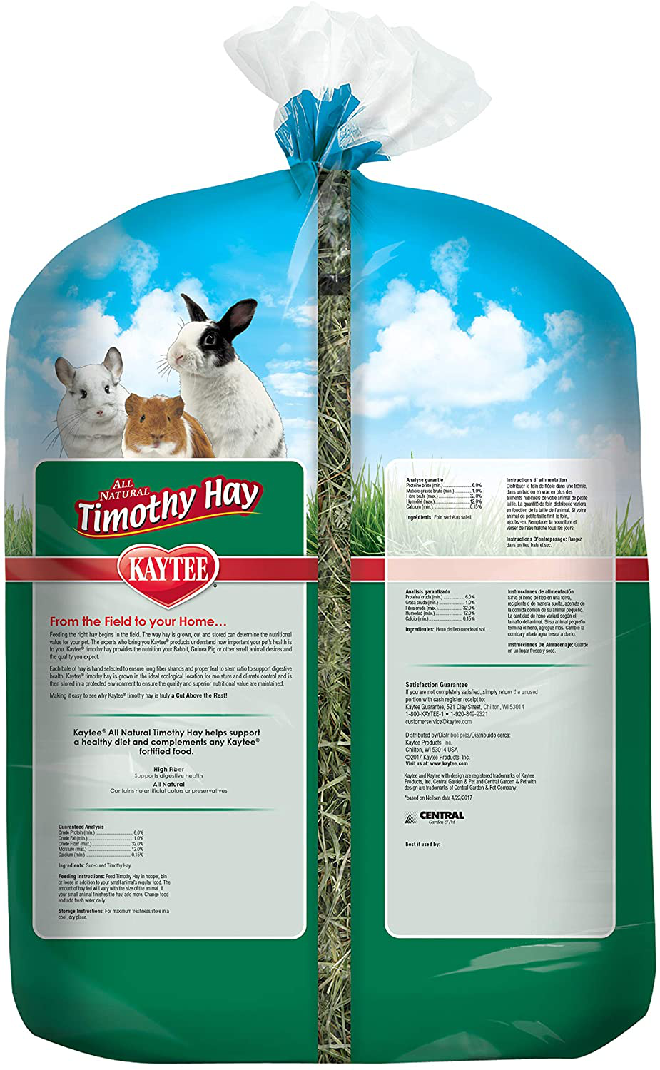 Kaytee feeds more hay to small pets than anyone else. We pride ourselves on providing fresh, tasty, all-natural hay. Grown specifically for small animals, timothy hay is hand selected to ensure long fiber strands and a proper leaf to stem ratio to support your small pet’s digestive health. At Kaytee, we understand that taste matters. Our hay tastes better because it is naturally grown and harvested with care. It is grown in fertile farmland graced with abundant sunlight and nourished by cool, rocky mountain water. Naturally grown without pesticides or artificial ingredients, our farmers only grow supreme grade hay. This means, high quality and superior nutrition for your small pet. At Kaytee, we are committed to harvesting the best nature has to offer. Satisfaction Guaranteed or your money back.
