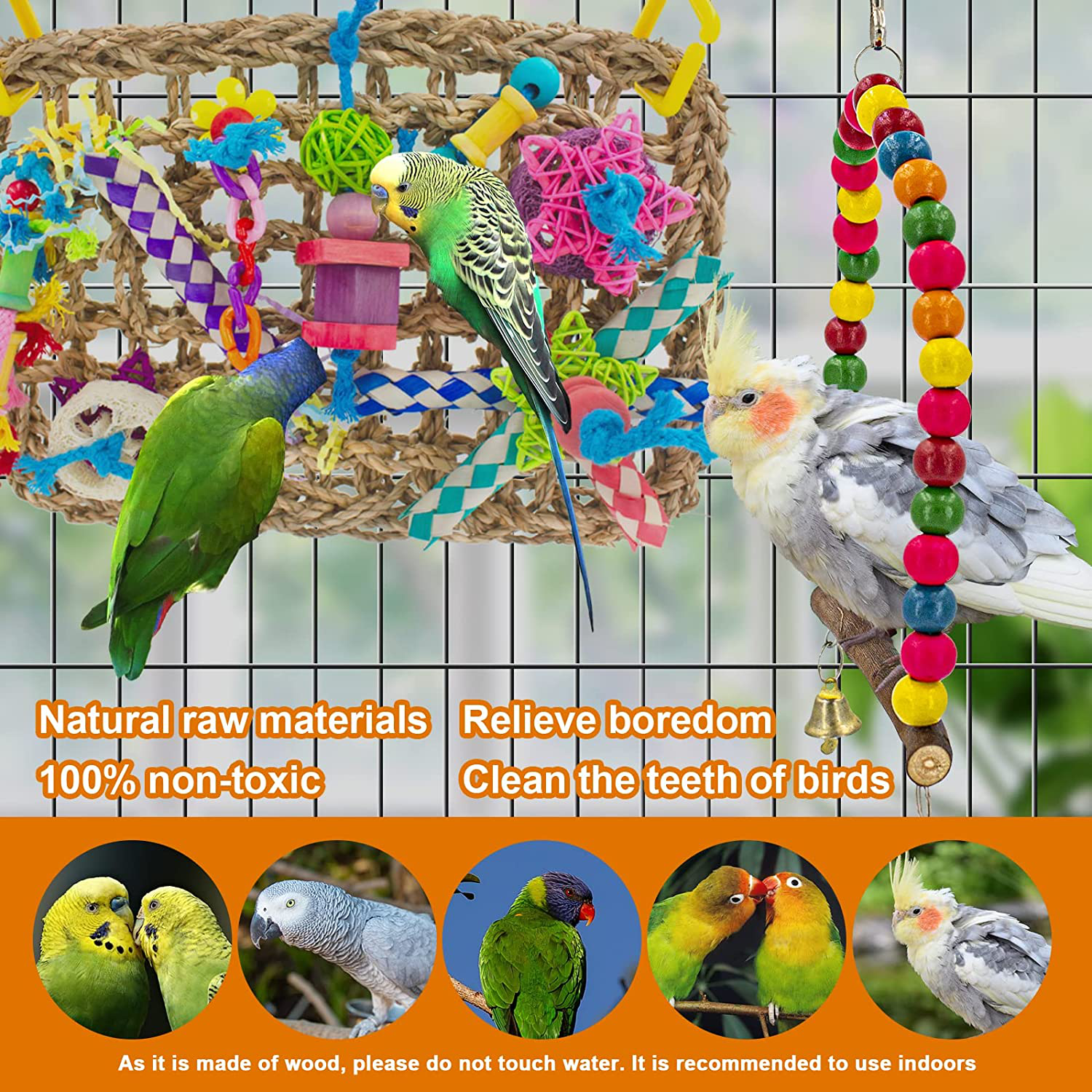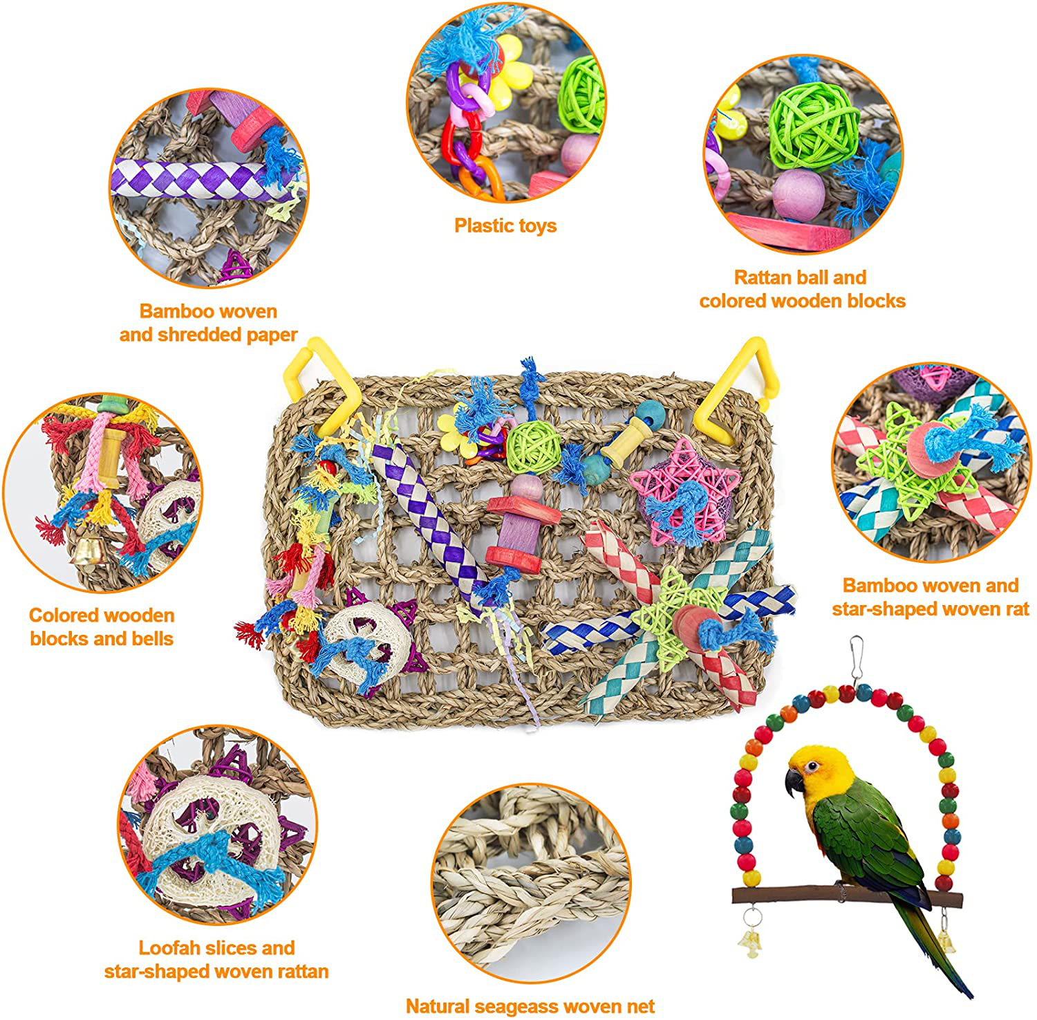 • 🦜【Edible Non-toxic Material】Our bird toys and perches are made of pure logs, edible seagrass, non-toxic ABS materials and cotton rope, all of them are dyed by food pigments, safe for birds to chew and peck. There is enough space in the weaving grid to not get stuck in the neck of the parrot. Keep your cockatiels away from safety hazards while playing joyful.