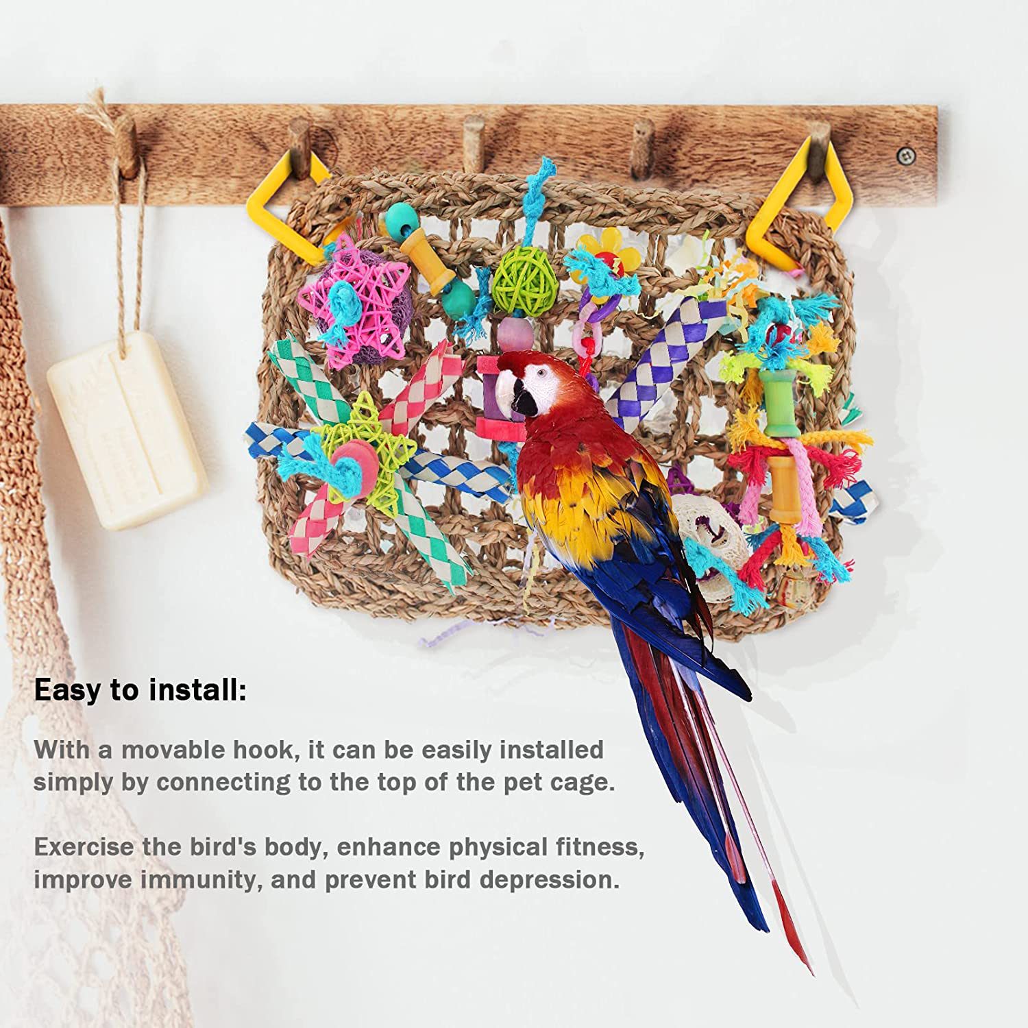 • 🦜【Attentive Design】 All types of pet birds love to peck, chew, shred, preen and climb. This bird climbing hammock mat meets most birds' daily needs, build muscles and develop intelligence. The chewing toys on the climb net can be removed, this combination design can entertain and exercise as well as satisfy birds' peaking and climbing instinct. Bird toy mat comes with two safe hooks which are easy to connect to any places,saving space and decorate your little pet birds' habitat.