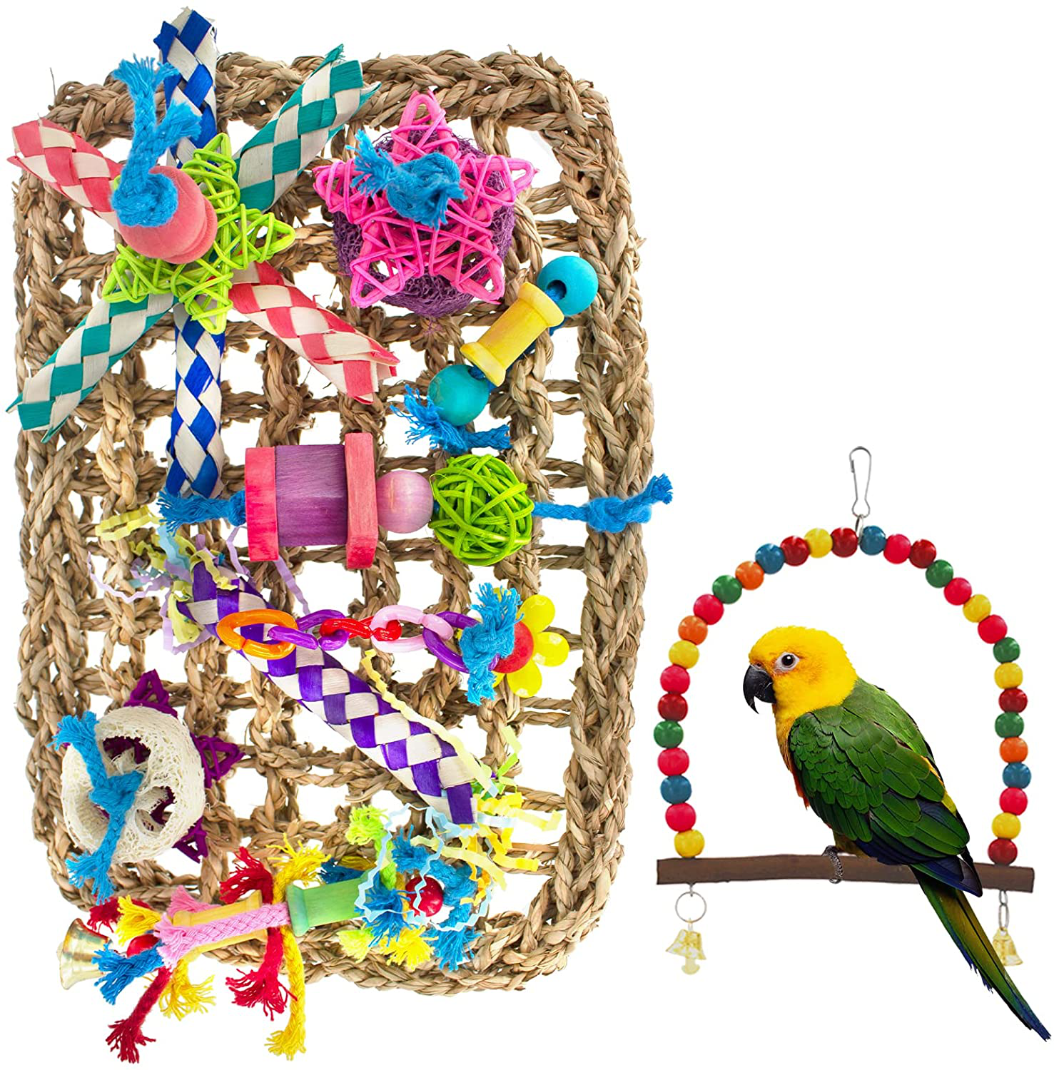 MHHOL Bird Parakeet Toys, Bird Foraging Wall Toy, Bird Perches Swing, Edible Seagrass Woven Climbing Hammock Mat with Chewing Toys, Bird Shredder Toys, for Parrots, Conures, Cockatiels, Budgies