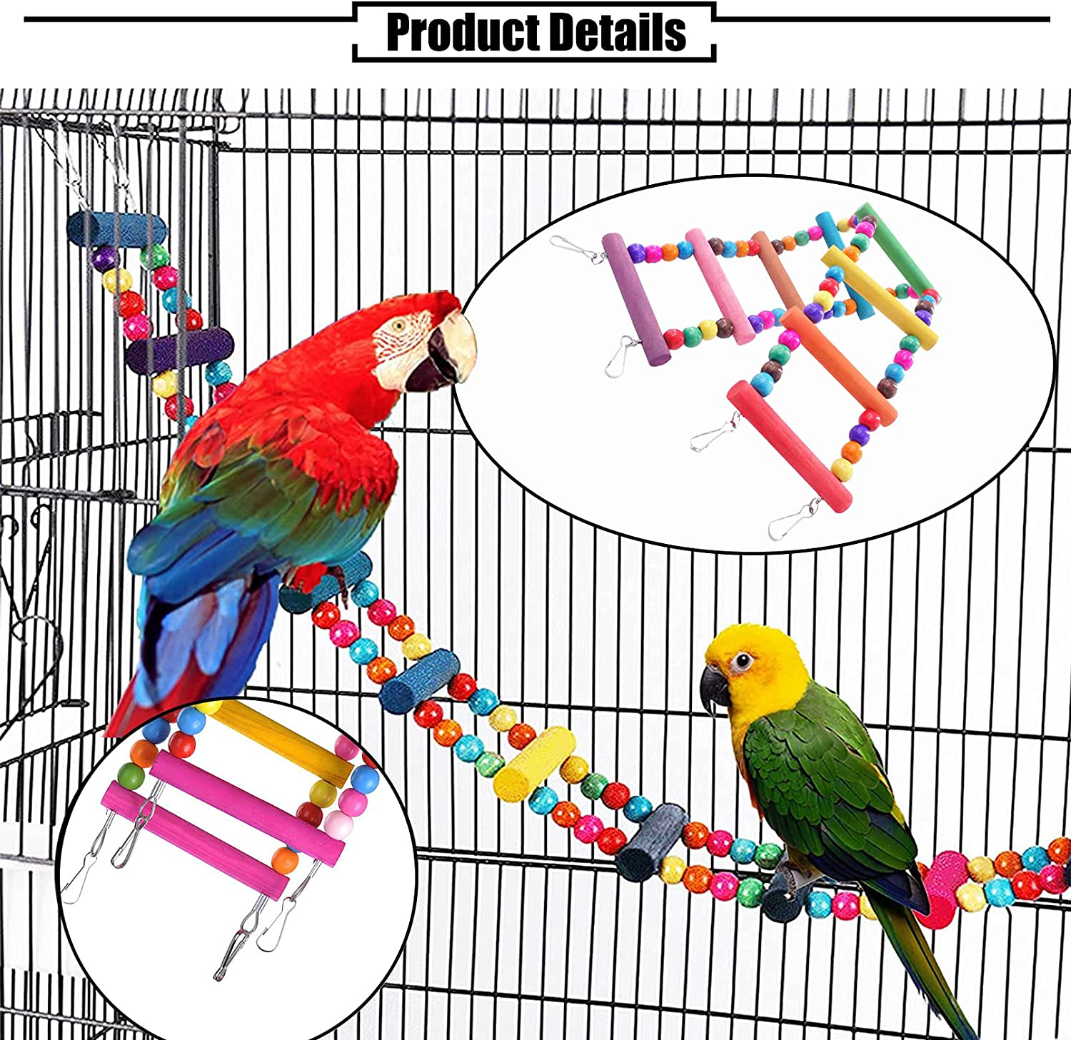- 【10 PCS Package Include】PINVNBY birdcage toy consists of 10 packs different types toys, 1*Color Beads Parrot ladder,1*Rotate Climb beads pendant,1*Mirror bell pendant,1*Round beads pendant,2*hanging bells toys,1*Chewing rattan balls bell pendant,1*Colorful Cotton Rope Chew Toy,1*Colorful Paper Tape Chew Toy,1*Colorful Beads Hanging Toy. It will meets your parrot various needs to having fun and is the ideal gift for pet birds.