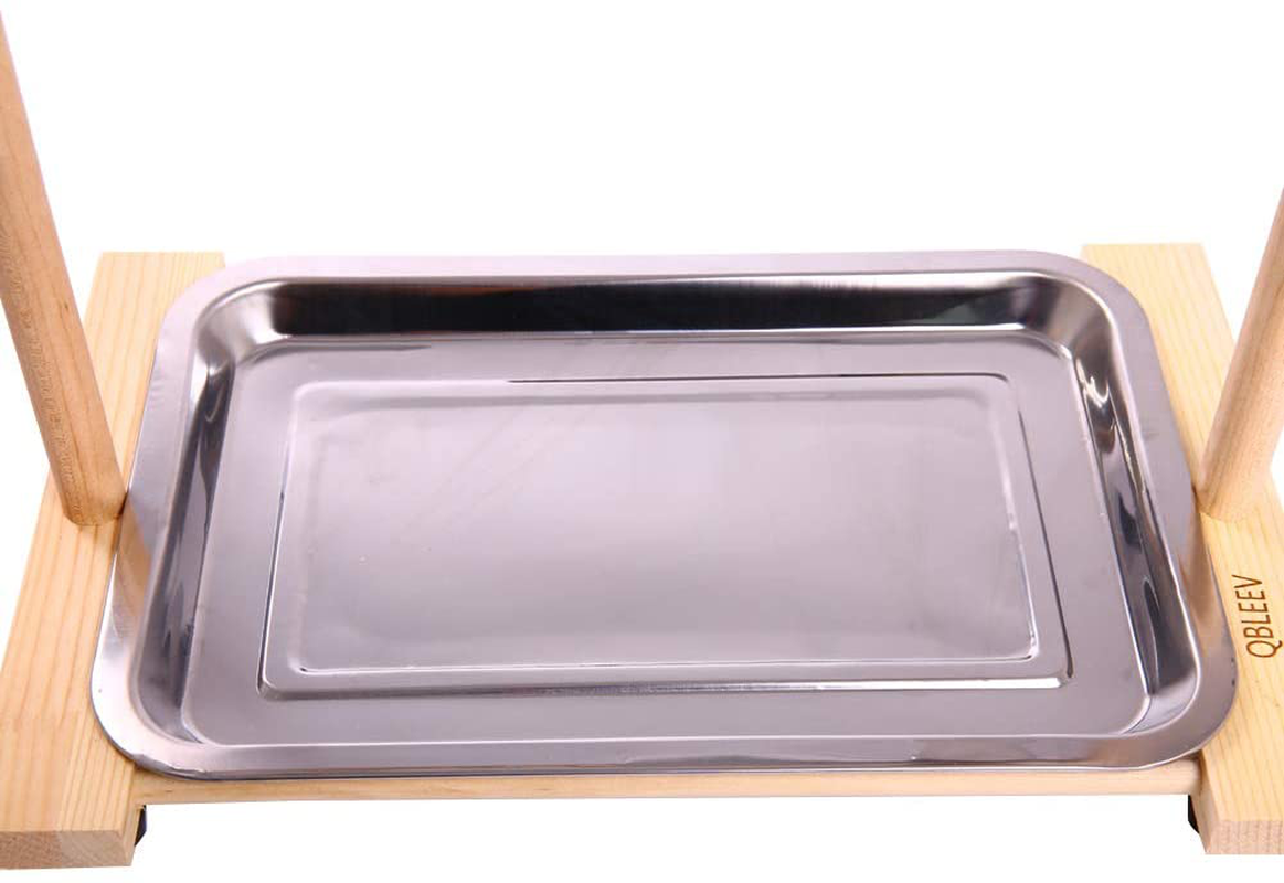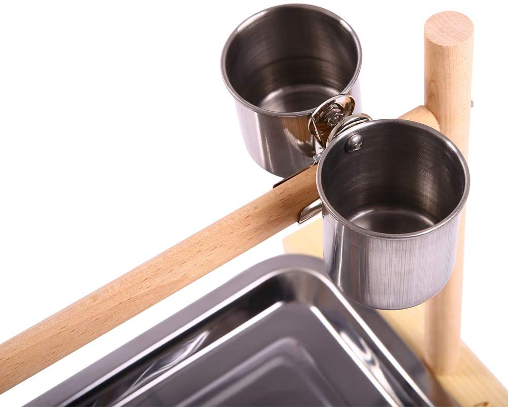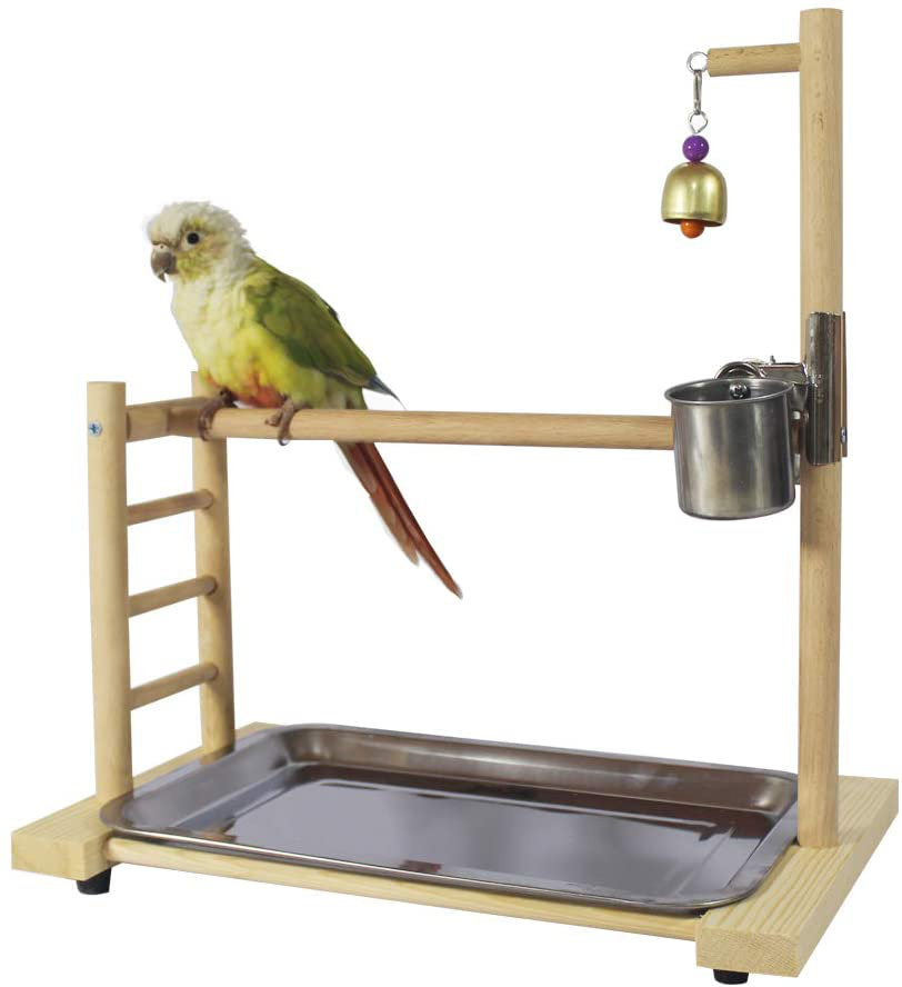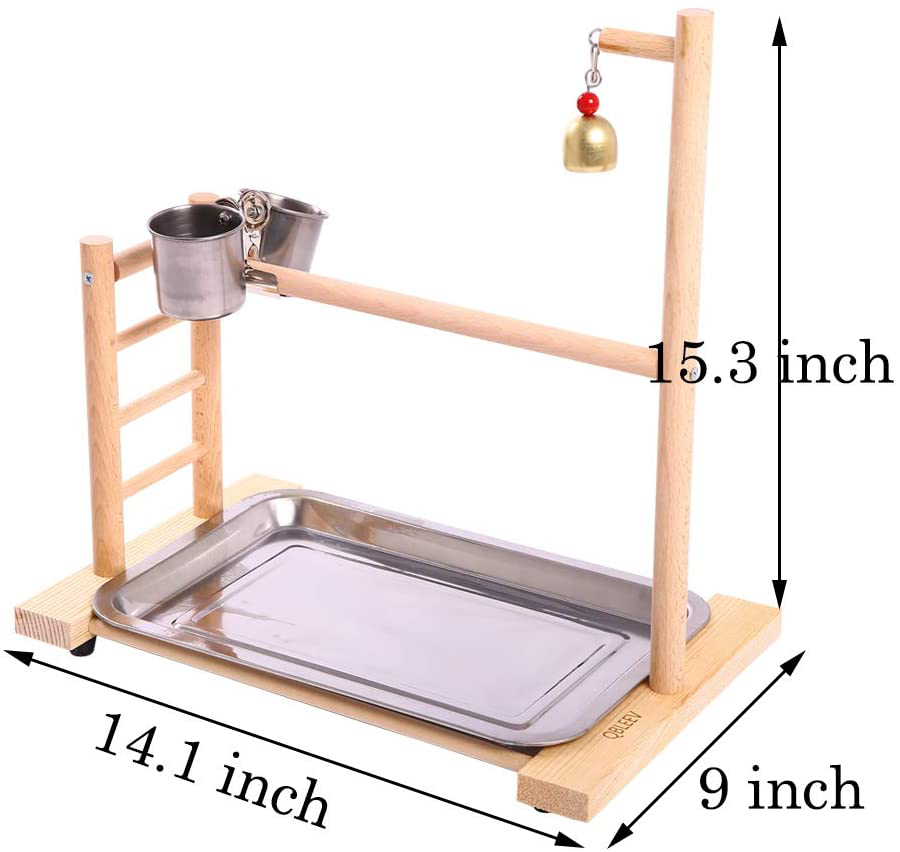QBLEEV Birdcage Stands Parrot Play Gym Wood Conure Playground Bird Cage Stands Accessories Birdhouse Decor Table Top Playstand with Ladder Stainless Steel Feeder Cup Tray for Small Medium Parakeets Ca