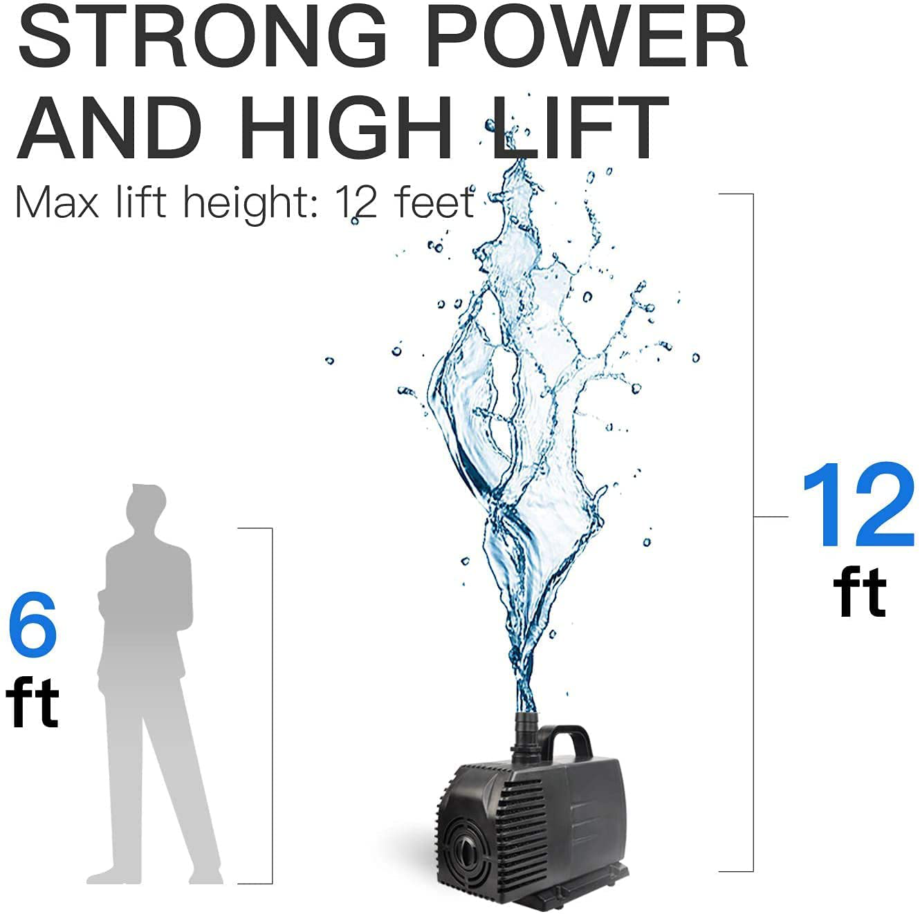- #1 has pre-filter included - Pre-filter on the intake prevents debris from entering your pump and extend the life of your pump, max flow rate: 1056 GPH, max lift height 12 feet