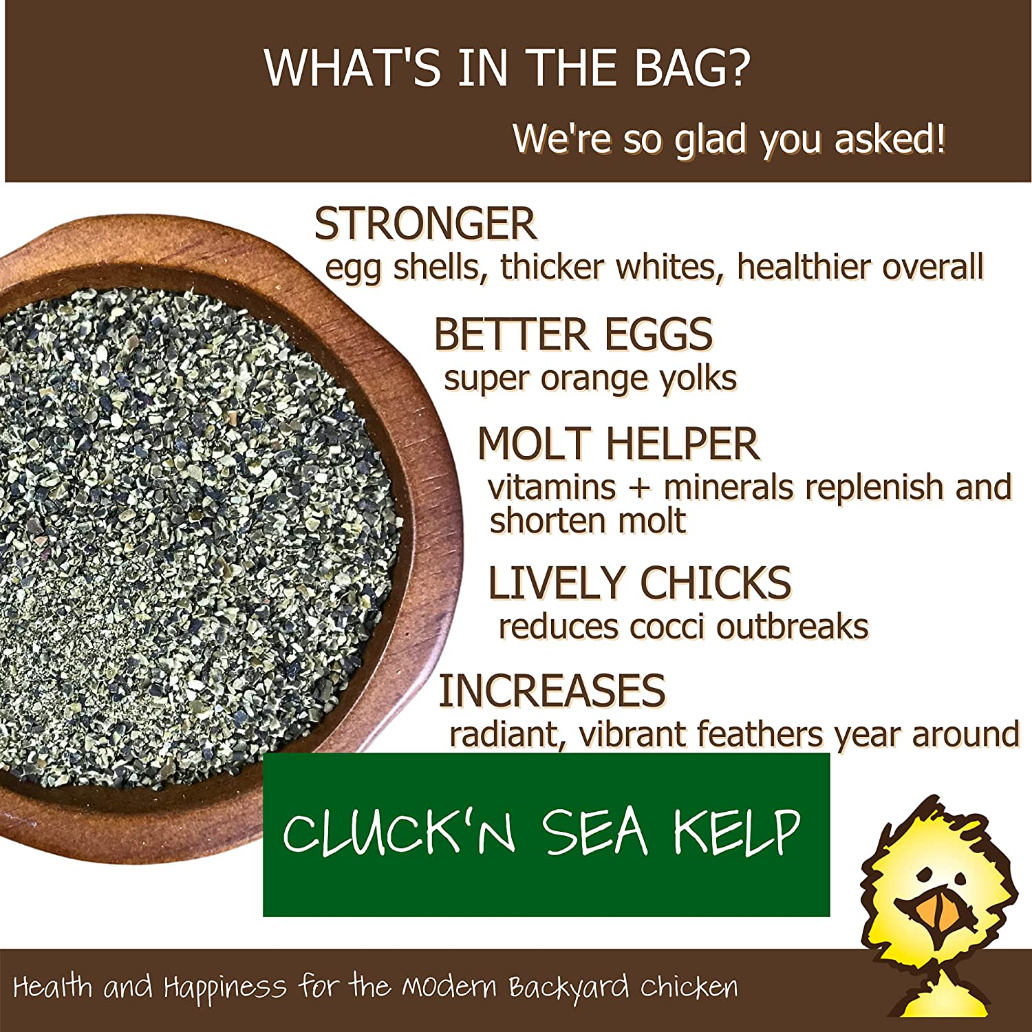 - SEA KELP FOR CHICKENS: 2 Ib Bag of Cluck’n Sea Kelp is the easiest way to give your flock a big nutritional boost with a long list of added minerals and vitamins for chickens.