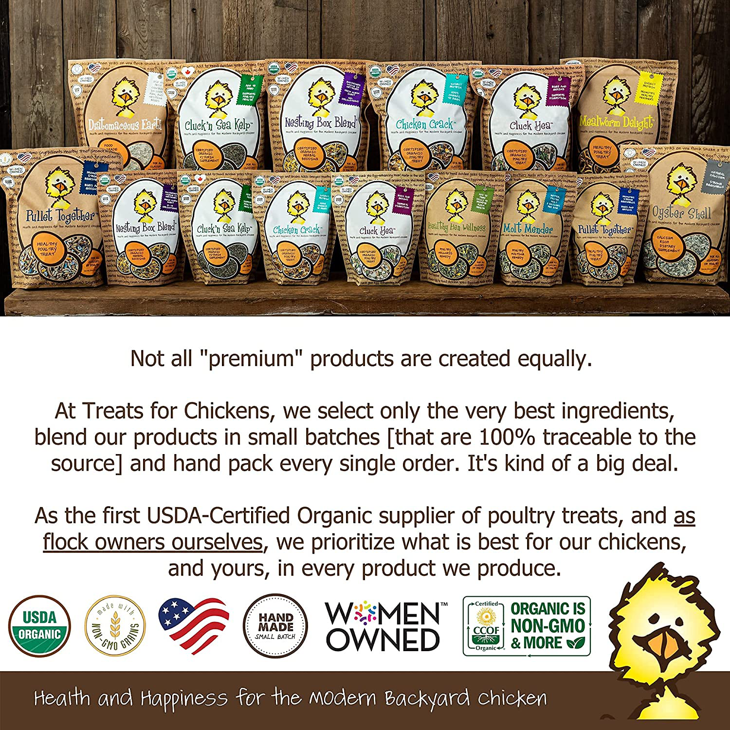 - TREATS FOR CHICKENS (The Brand): We want the best for our flock too, because just like you, we happily eat the eggs our chickens lay. That’s why we’ve prioritized organic ingredients in our formulas since the beginning & became the very first USDA-Certified Organic supplier of poultry treats, vitamins and herbal bedding. Check out our full line of chicken & poultry products.