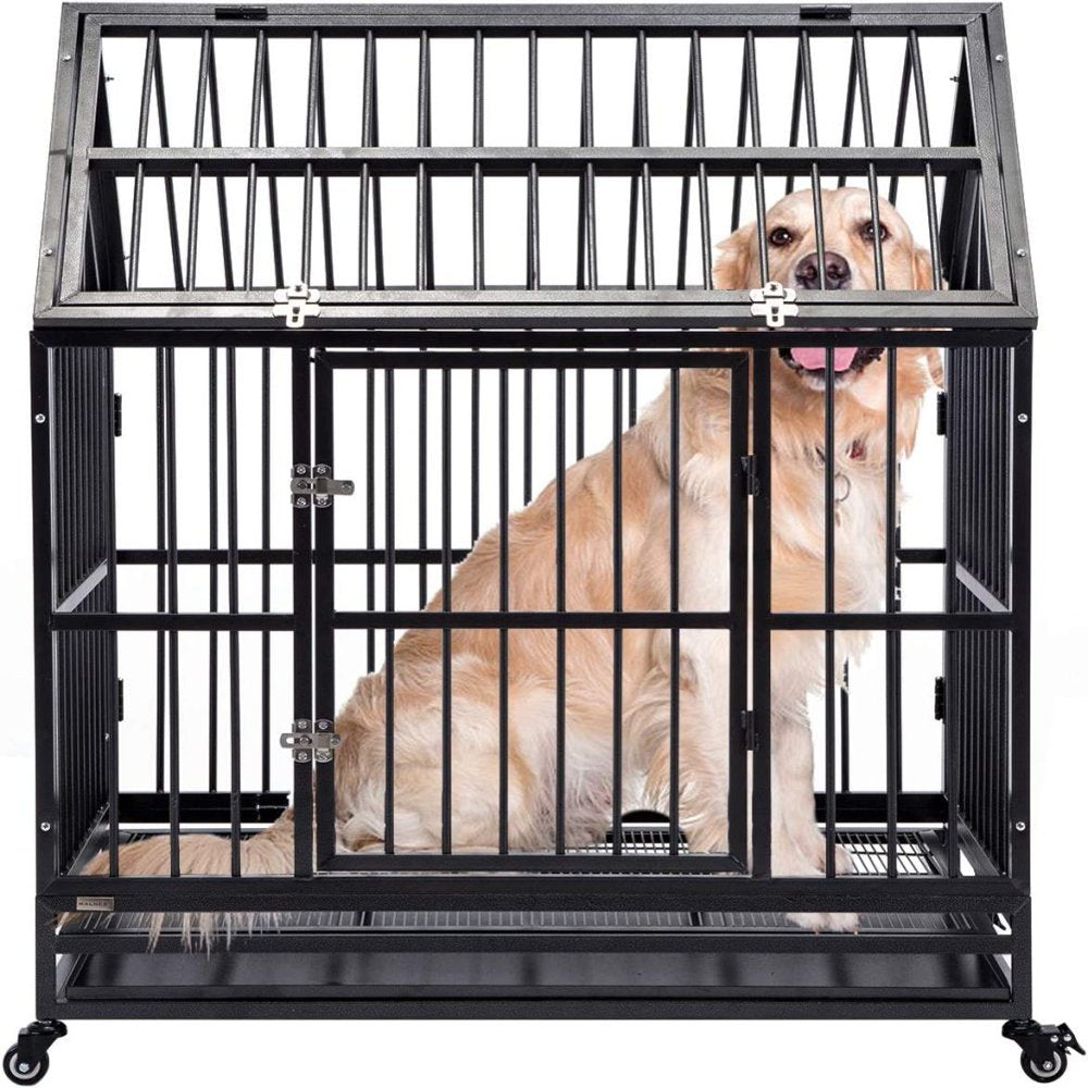 Description:Our heavy duty dog crate with heavy duty rust and corrosion-resistant steel frame, strong and durable equipped with four wheels for easy to move and two of them are lockable to avoid accidental move. Easy to assemble and folds down easily, you can storage it anywhere. Specification: OVERALL DIMENSIONS: 42"L X 30"W X 35"H; Color: SilverDog: suitable for most medium and large dogs