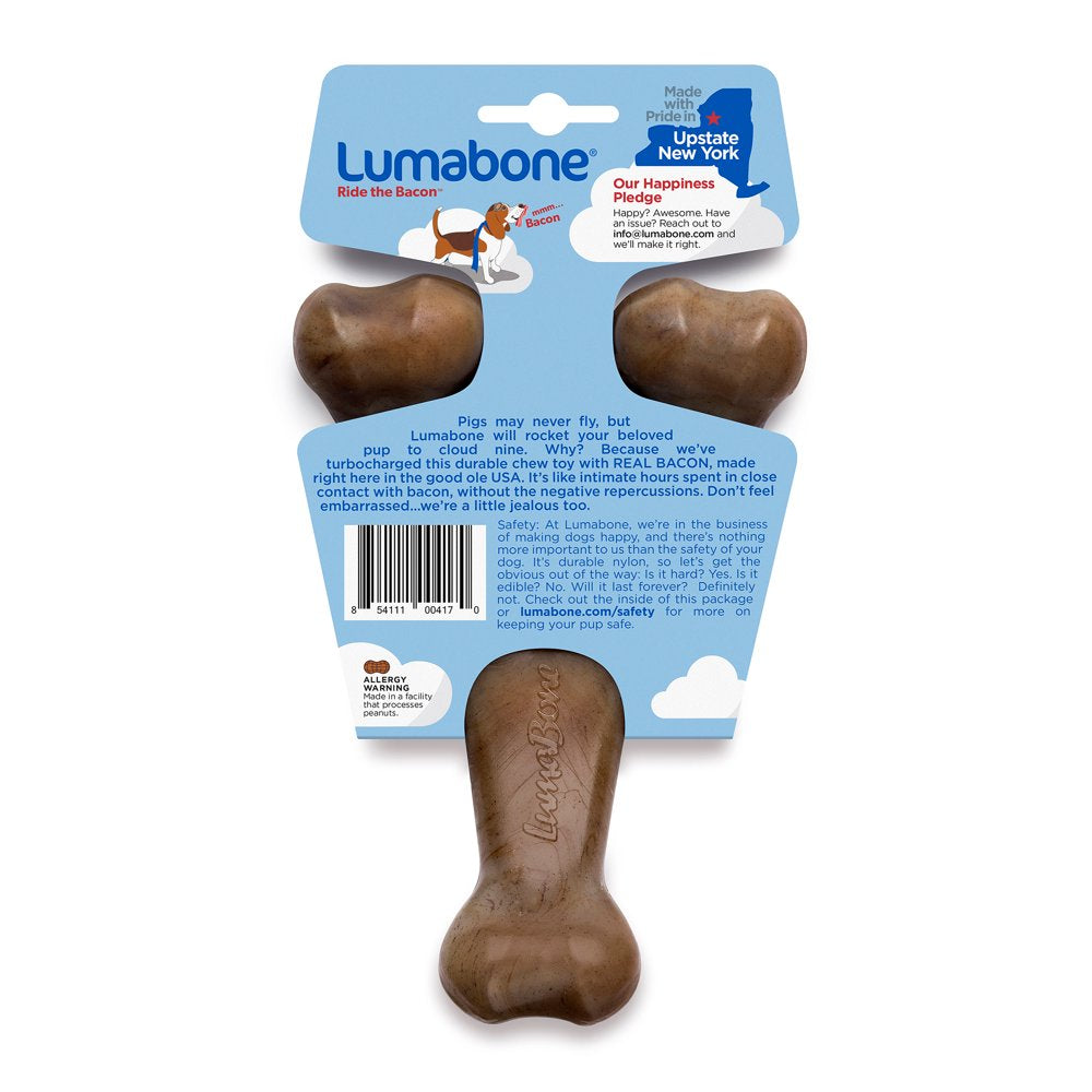 Lumabone Real Bacon Flavored Medium Wishbone Dog Chew Toy is durable and cleverly designed with curves and ridges so your pup can get a good chew going. It is made with 100% REAL BACON for irresistible flavor and scent-Dogs can tell the difference. sourced and manufactured in the . Lumabone dog toys are not edible and should be discarded/replaced when appropriate.