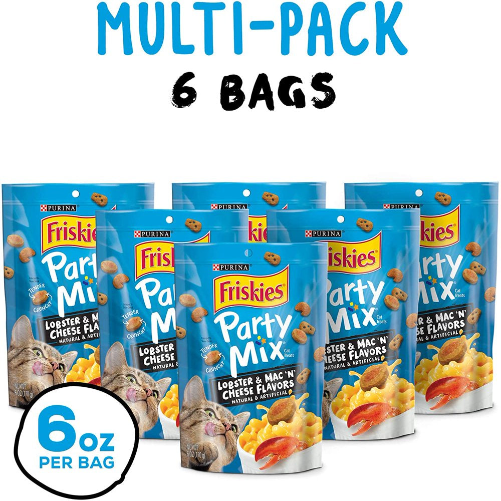 • Six (6) 6 oz. Pouches - Purina Friskies Made in USA Facilities Cat Treats, Party Mix Lobster & Mac 'N' Cheese Flavors