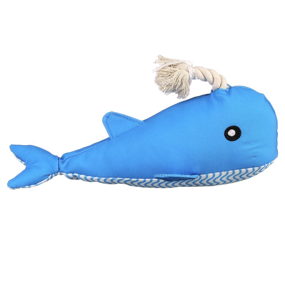 Our Vibrant Life Blue Whale Plush Toy is the perfect pet toy for both the eco-conscious and pet-conscious individual. Every Vibrant Life Toy is made from recycled materials to help keep plastic out of landfills, which means that even if your dog destroys their toy and you have to get another, you'll be doing your part in contributing to a greener environment while keeping your dog happy, too. With plenty of whale to chew on, like the crinkly fins, knotted rope spout, and the head and tail with internal squeakers, your furry friend can look forward to spending countless hours with their new toy. Smooth, soft, and rough textures give your pet plenty of sensory input and different thicknesses to enjoy chewing on. The different textures, bright color, and traditional squeaky and crinkly sounds will keep your dog active and engaged for hours.