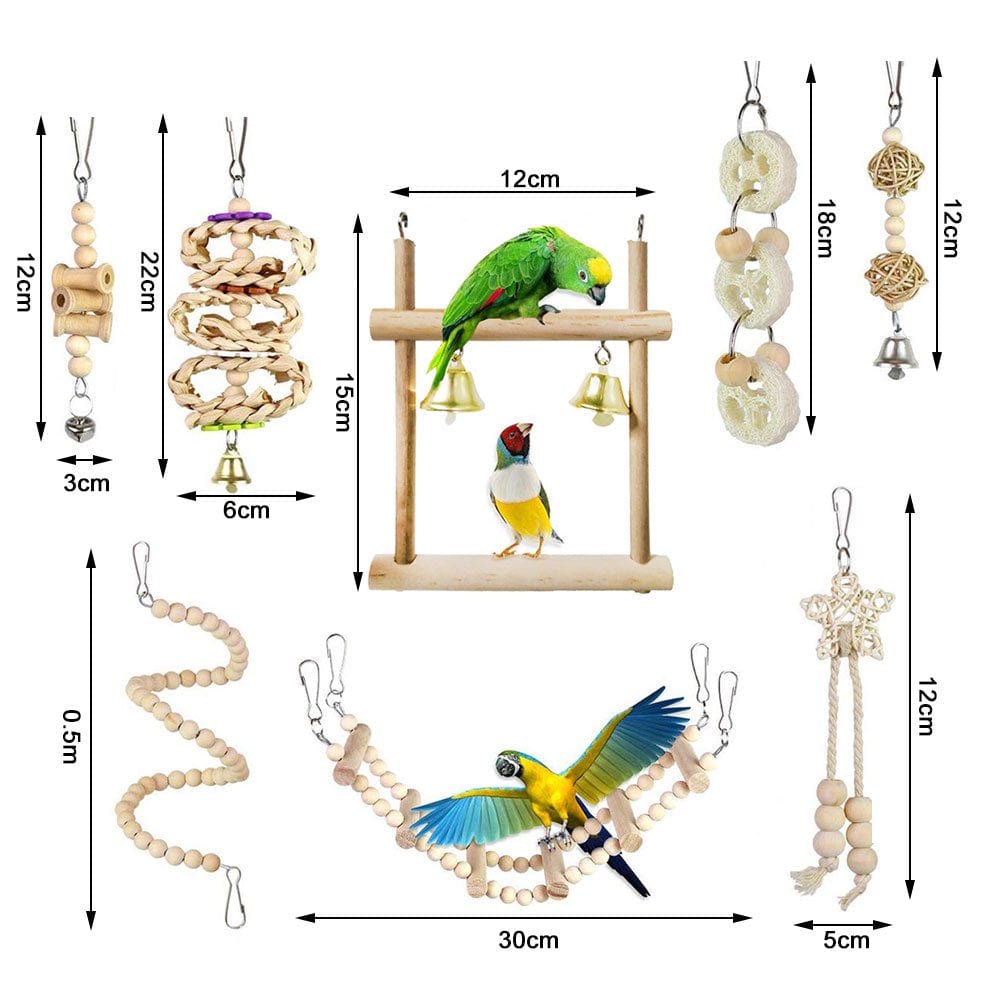 8Pcs Bird Parrot Swing Toy Wooden Bell Bird Cage Chew Toys Pet Bird Supplies for Parrots Parakeets Cockatiels Conures Finches Budgie Parrots Love Birds Australian Parrot Small Birds