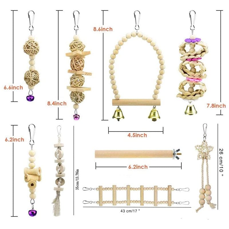 Pmulti-function bird toy: The bird toys include 9 different parrot toys to meet any pet bird's needs.natural wooden toys and crisp bells sounds can attract the attention of pet birds, they are suitable for parrot sports,standing,climbing, playing, chewing, resting,etc. It's the perfect gift for pet birds.