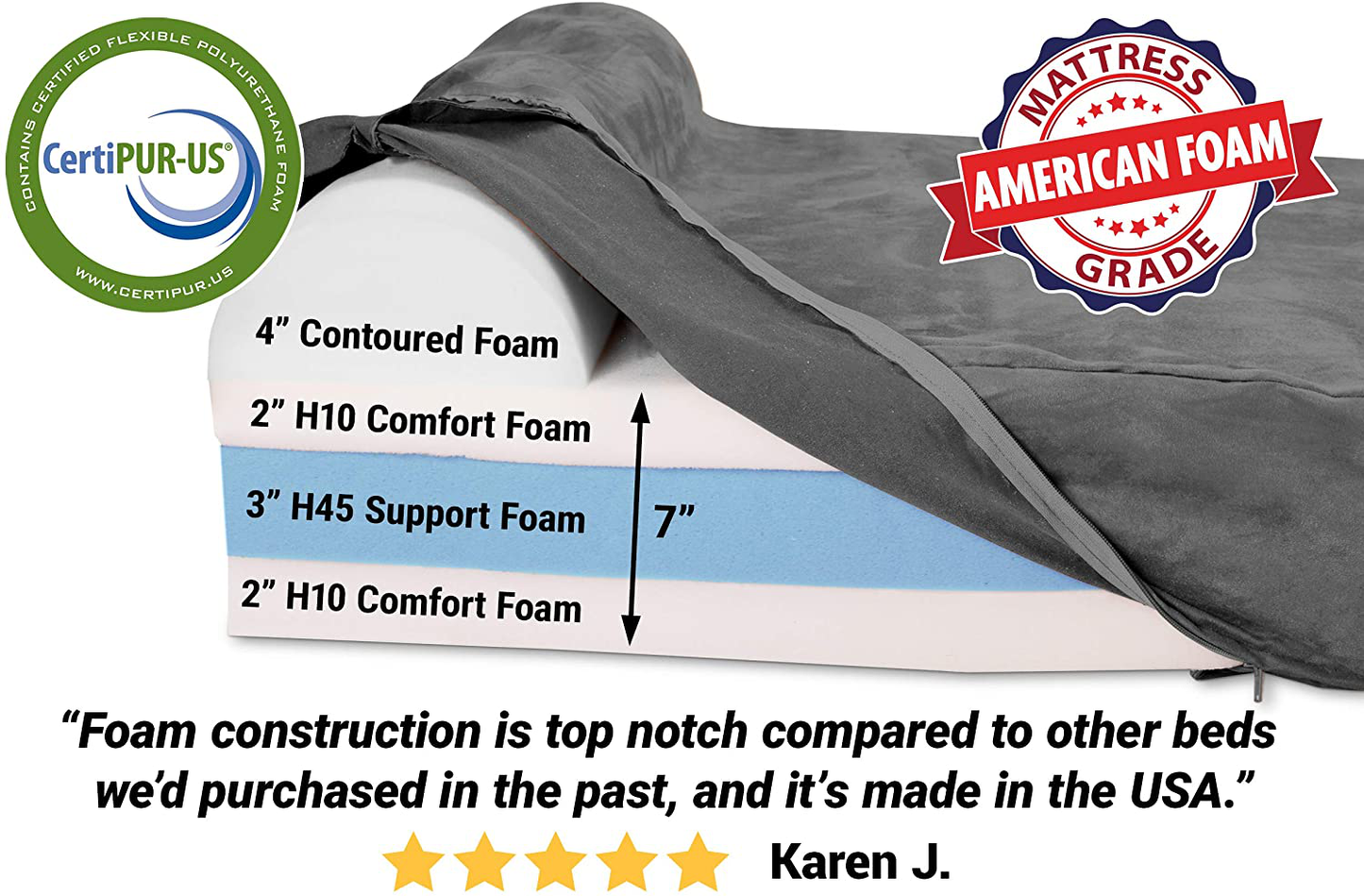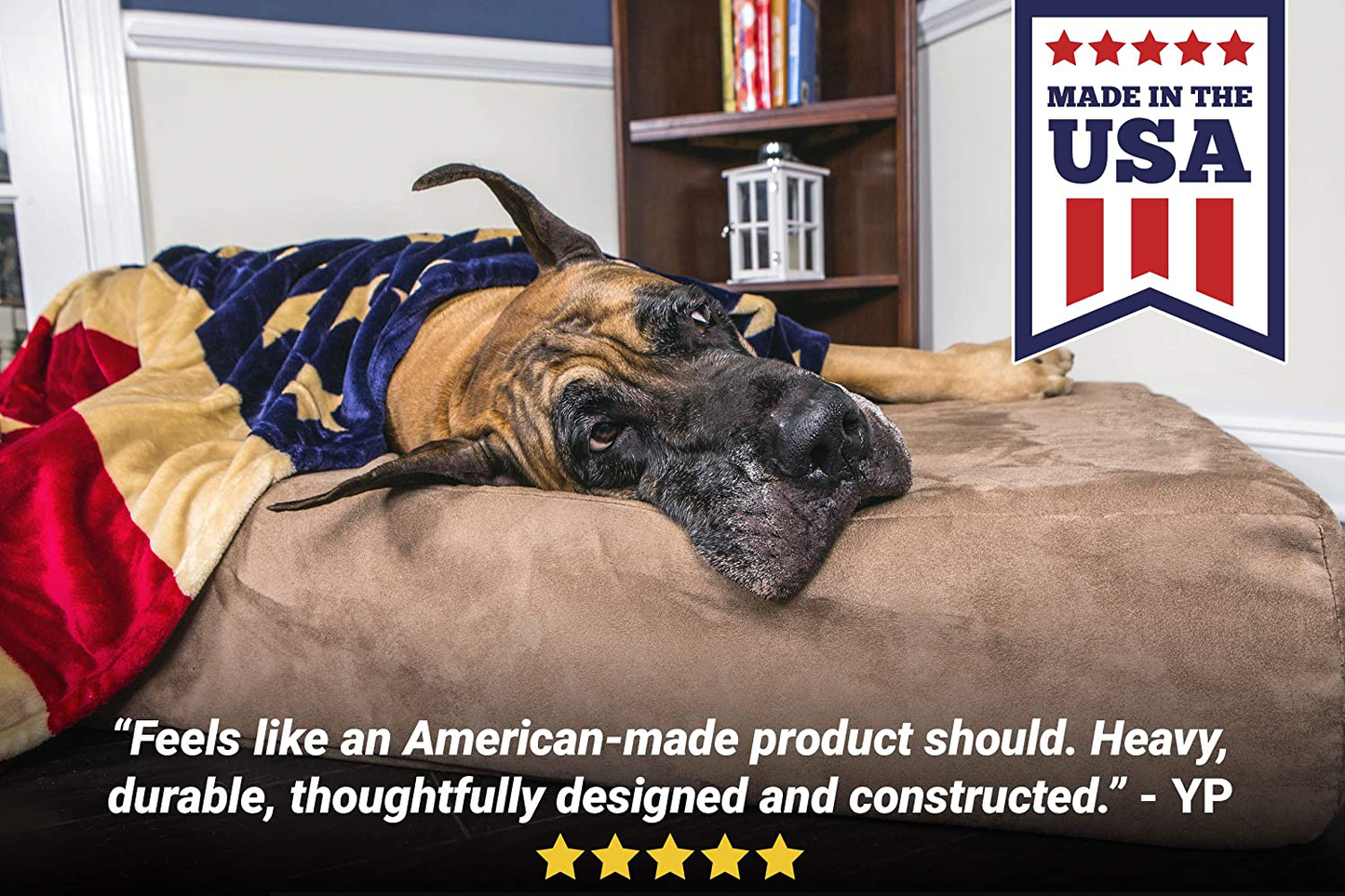 Your Big Barker is made in our small Pennsylvania workshop with 7" of our proprietary American Made OrthoMedic foam. Engineered as a high-end mattress, but specifically calibrated for big dogs. Supports every curve of a big dog's body. Big dogs don't sink through the bed, full-grown humans feel comfortable laying on a Big Barker. Lay on it yourself and you'll feel the difference immediately.