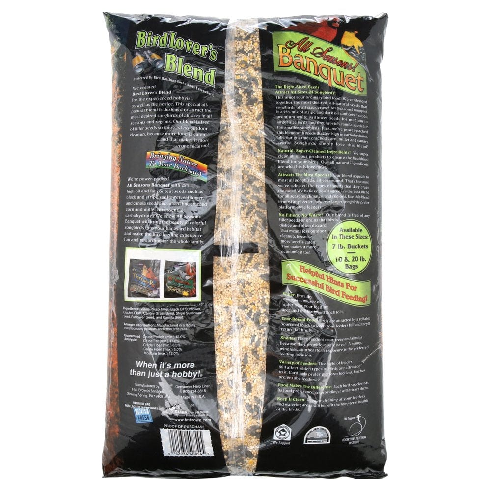 Brown’s created Bird Lover’s Blend for the experienced hobbyist and novice alike. This special blend is designed to attract the most desired birds in all regions during all seasons. We drew on the experience of six generations of the Brown’s family to develop this product; we know it will bring the beauty of colorful songbirds to your backyard habitat and make the bird-feeding experience fun and rewarding for the whole family. Bring Nature to Your Backyard: We power packed All Seasons! Banquet with 25% high oil- and fat content seeds, such as black oil and striped sunflower, safflower, and canola seeds. We also added fine cracked corn and millet for essential carbohydrates and energy. All Seasons! Banquet will bring the beauty of colorful songbirds right into your backyard habitat. The Right-Sized Seeds Attract All Sizes of Songbirds: This is not your ordinary bird food! We blended the most desired natural seeds that songbirds of all sizes crave! All Seasons! Banquet is a 25% mix of striped and dark oil sunflower seeds, premium white safflower seeds for medium-to-large birds, and tiny fat-rich canola seeds for small songbirds. We power-packed this blend with other seeds that are high in carbohydrates like our gourmet cracked corn, millet and canary seeds. Songbirds simply love this blend! Natural, Super-Cleaned Ingredients! We super-clean all our ingredients to ensure the healthiest blend available for your birds. Our natural ingredients are what birds love most. Attracts the Most Species! Our blend appeals to most songbirds, all year round. That’s because we selected the types of seeds they crave the most! We believe you’ll agree it’s the best blend for all seasons, climates, and regions. Use this blend in any feeder, but large birds prefer platform feeders. No Fillers & No Waste! Our blend is free of any filler seeds or grains that birds dislike and often discard. This means less outdoor cleanup, because more food is eaten. It’s more economical to feed too! • Contains 25% Black Oil Sunflower & Canola Seeds • Attracts Songbirds of All Sizes! • Preferred By Bird-Watching Enthusiasts Everywhere Ingredients: White Proso Millet, Black Oil Sunflower Seeds, Cracked Corn, Canary Grass Seed, Stripe Sunflower Seeds, Safflower Seeds, and Canola Seeds. Guaranteed Analysis: Crude Protein (min) 13.0% Crude Fat (min) 17.0% Crude Fiber (max) 8.0% Moisture (max) 12.0%