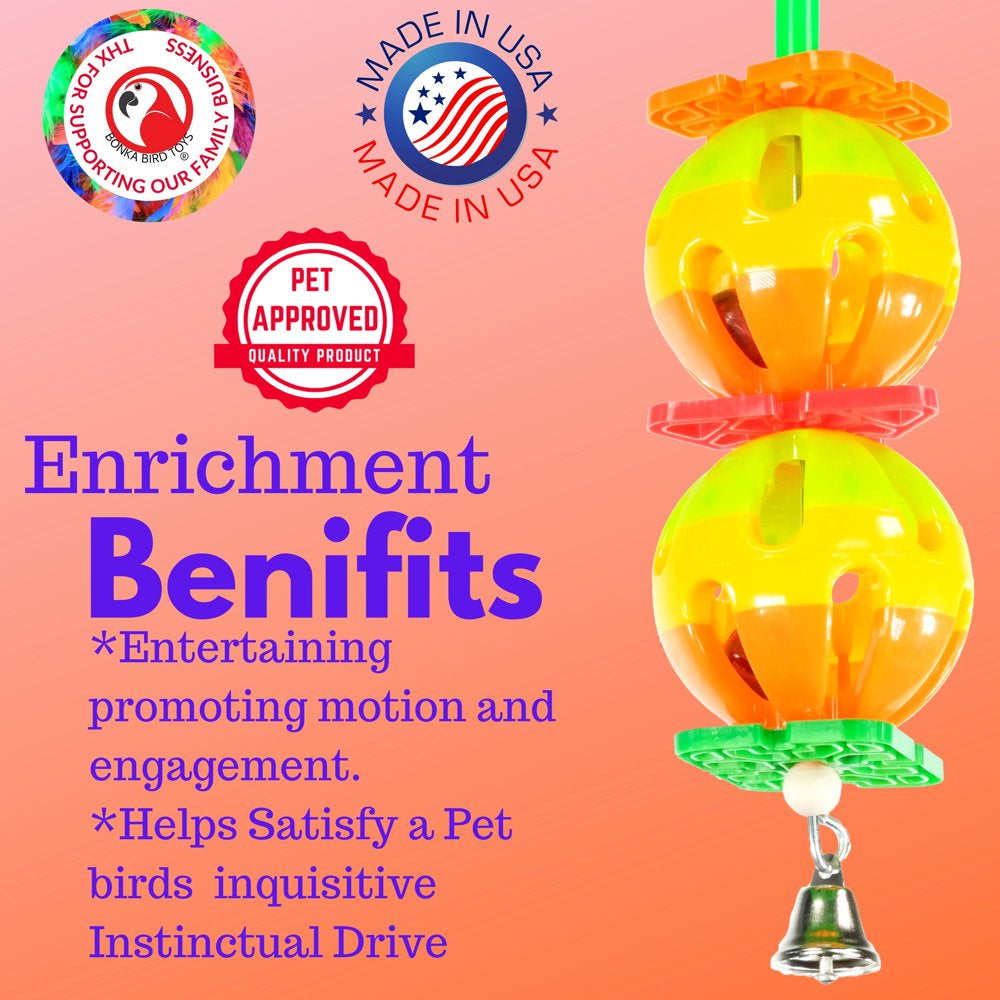 The 1570 Twin Ball From Bonka Bird Toys it's a colorful and pleasing edition for your medium sized pet, two colorful rattle balls are pieced together with colorful plastic discs and it is finished out with a medium sized bell. They will climb, peck, and chew on this simple but effective toy. Height: (11) inches Width: (2.5 ) or ( 2 1/5) inches Weight: Under (5) ounces Entertains with sight, color, and sound. A colorful edition for any cage. All bird safe construction. Quick link for easy cage placement.