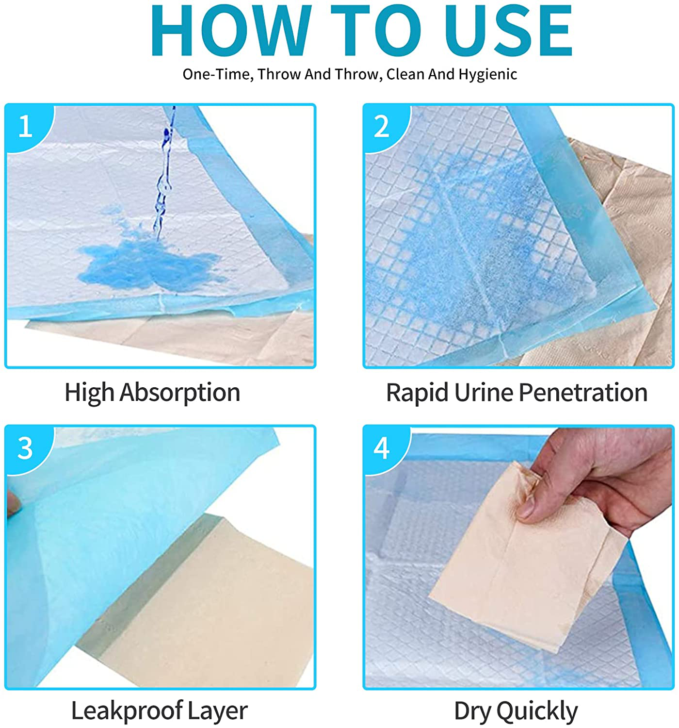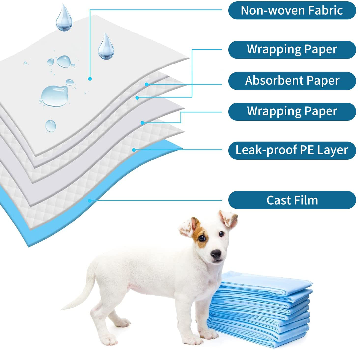 - 6 Layers Construction: The top layer can quickly absorb urine and keep the surface dry, and then use absorbent paper to absorb a lot of water. The last two layers use leak-proof PE layer and cast film to lock the liquid and protect your floor.