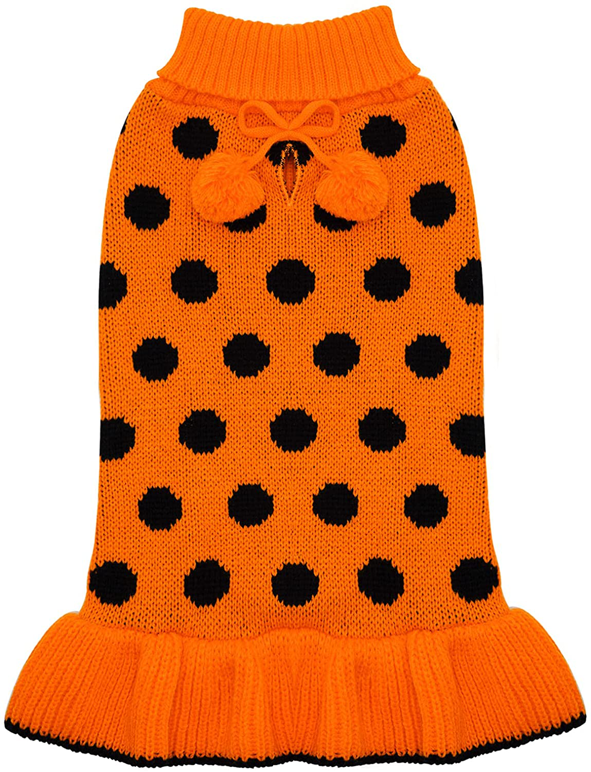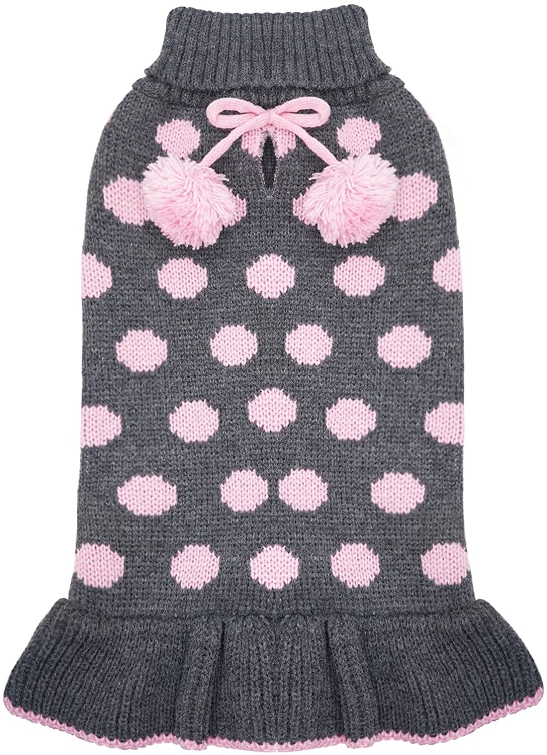 KYEESE Dog Sweater Dress Turtleneck Polka Dot Dog Sweaters with Leash Hole Knitwear Warm Pet Sweater with Pom Pom Ball