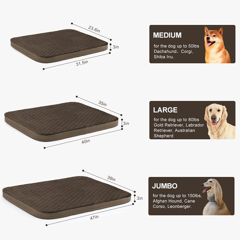 - Universal Size: Medium: 31.5 x 23.6 x 3 inches,Up to 50 lbs Dogs; Large: 40 x 35 x 3 inchs,Up to 80 lbs Dogs; Jumbo: 47 x 39 x 3 inches, Up to 150 lbs Dogs; Perfectly for Indoor or Outdoor Use of All Size Dogs,Such as Sofa,Car,Floor. Please Allow Foam Placed for 48 Hours Before the First Use.