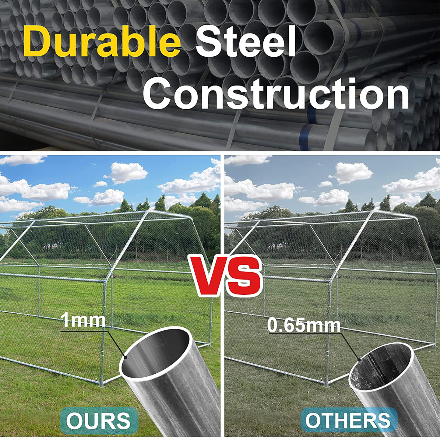 - 【Durable Steel Construction】Manufactured with high quality steel frame, the coop is solid enough for your chicken to have free space in it. And it is not easy to damage, which can prolong a long-term service time. Beside, the quick-connect frame allows for easy assembly. And our chicken coop has a upgrade reinforced design, The pipe wall we use is twice as thick as the pipe wall of someone else's cheap chicken coop!