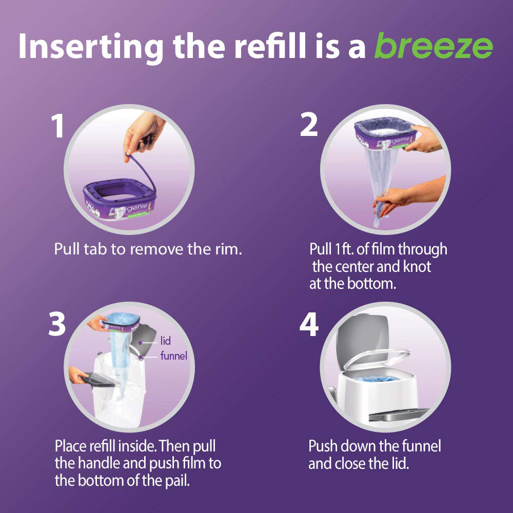 • EASY TO INSERT AND USE - to use in any Litter Genie pail, Simply pull out a foot of film, Push it through the center of the cartridge and tie a knot at the bottom. Then, open the lid and funnel of the pail, sit the cartridge on top, and push the refill through to the bottom.