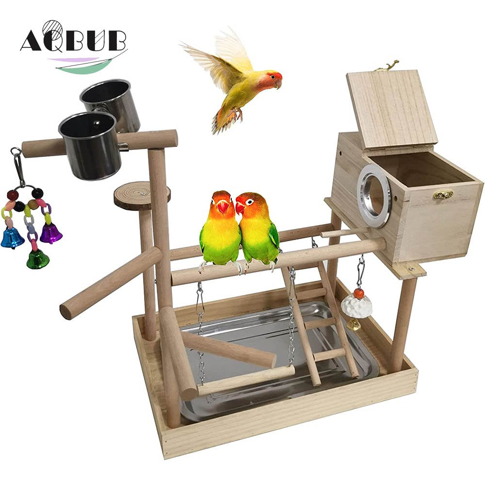 Parrot Playground, Bird Play Gym Wooden Perch Climbing Ladder Swing Chewing Toys and Parakeet Nest Box Feeding Cup Sports Activity Centre (Including Tray)