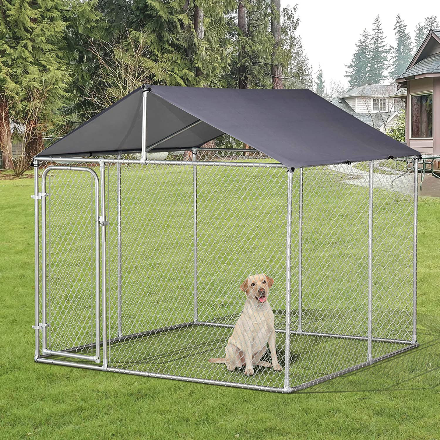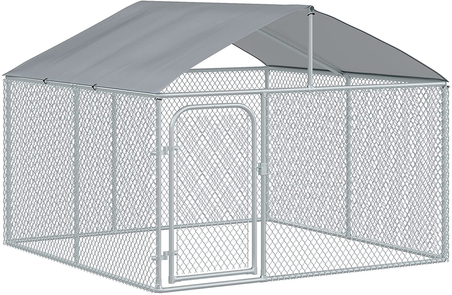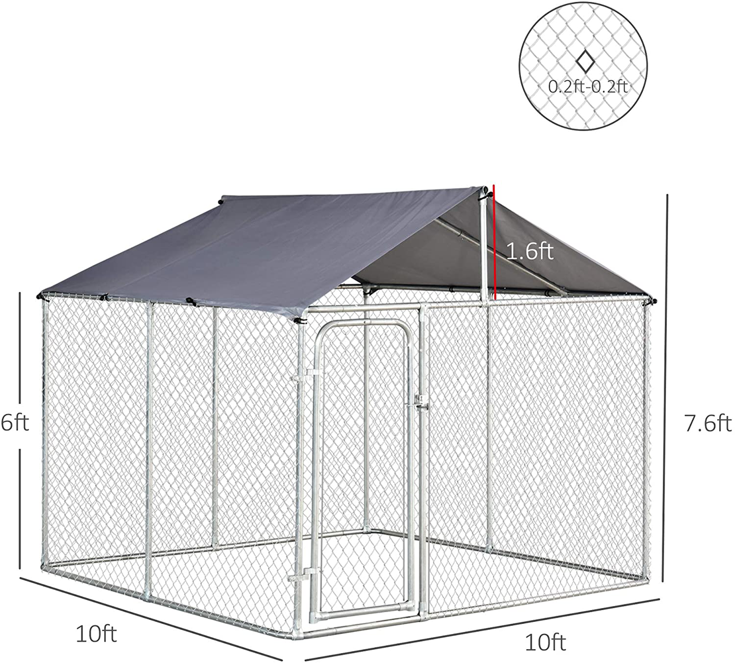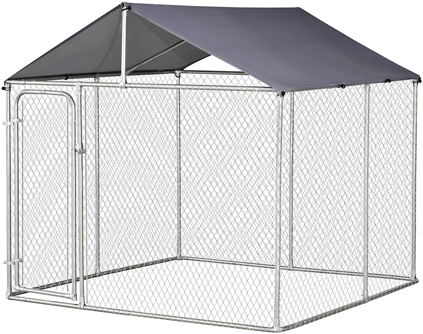 This chain link dog kennel with a covered roof from PawHut has everything you need for your pet. A tough metal frame ensures years of use with little to no necessary maintenance and is light enough to be relocated. This chain link dog fence can grow with multiple kennels and can be connected without additional parts to create a larger enclosure to keep up with your growing pet. Suitable for most medium animals including dogs, cats, and chickens. Don' hesitate to buy it!