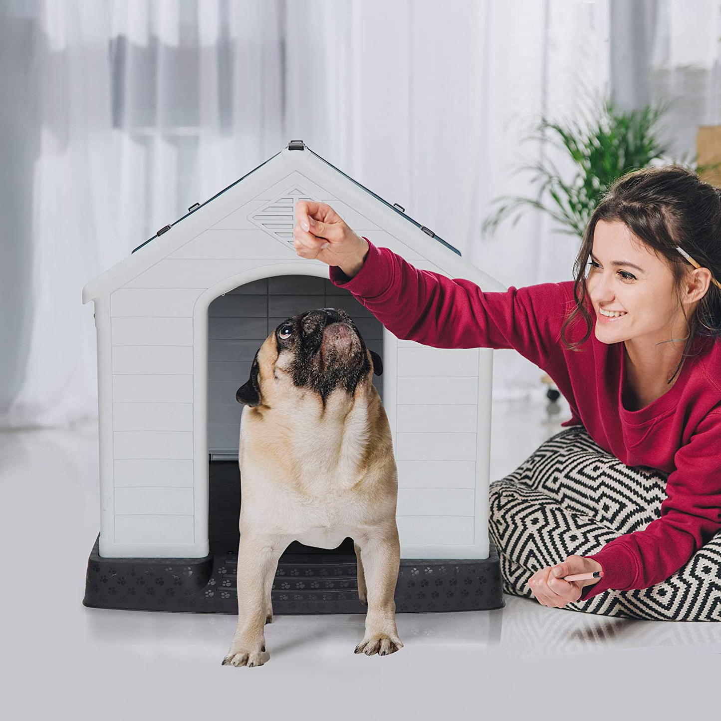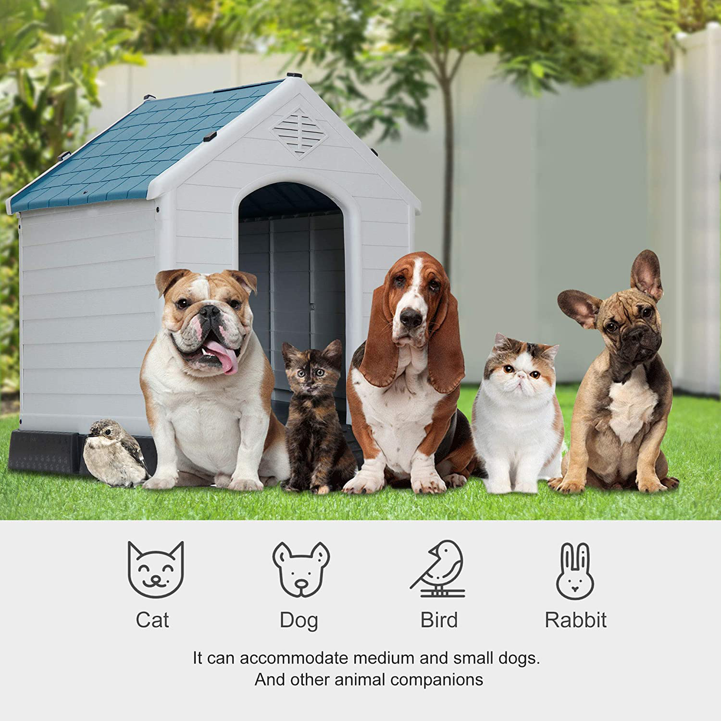 - Our pet dog house USES buckles and screws to secure the overall structure. This plastic dog house is ideal for backyard, patio, deck, etc.