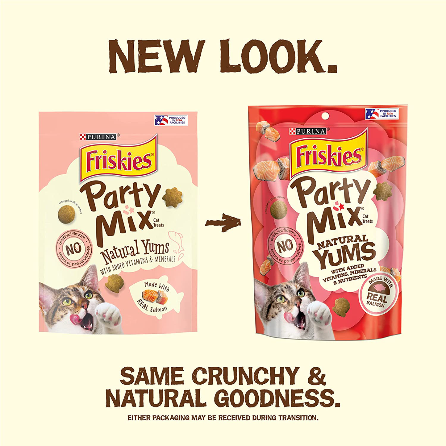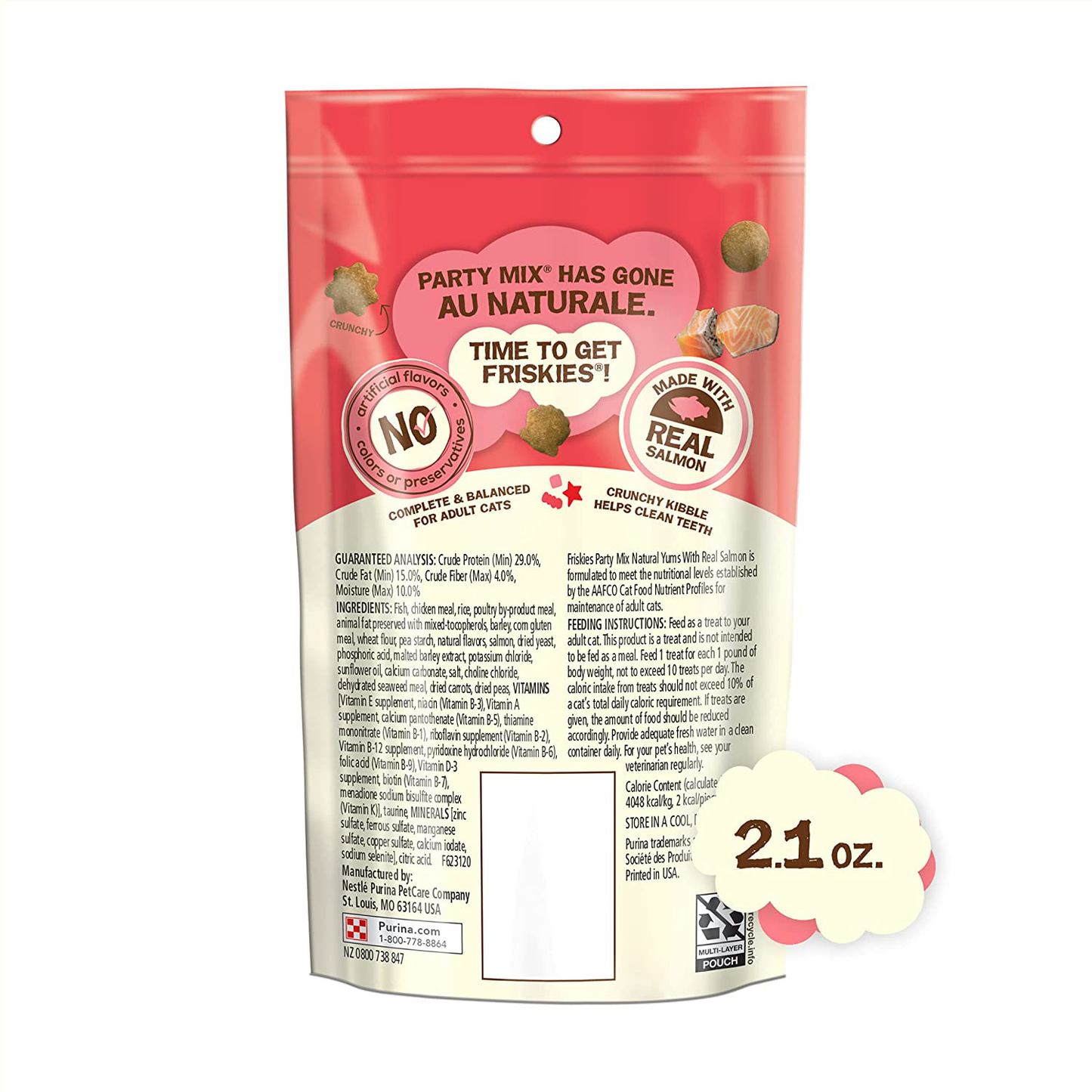 - Ten (10) 2.1 oz. Pouches - Purina Friskies Party Mix Natural Yums With Real Salmon Cat Treats