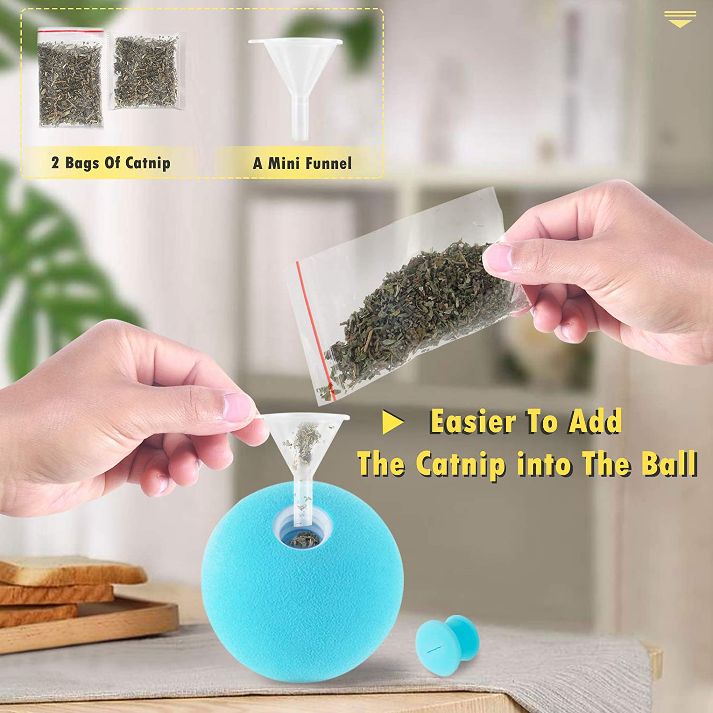 - 2. 2 Bags of Fresh Catnip Included - 2 bags of fresh catnip are included in this kitten toys. Easily open the lid on the cat toys balls and use the mini funnel provided to add the cat nip into the ball.