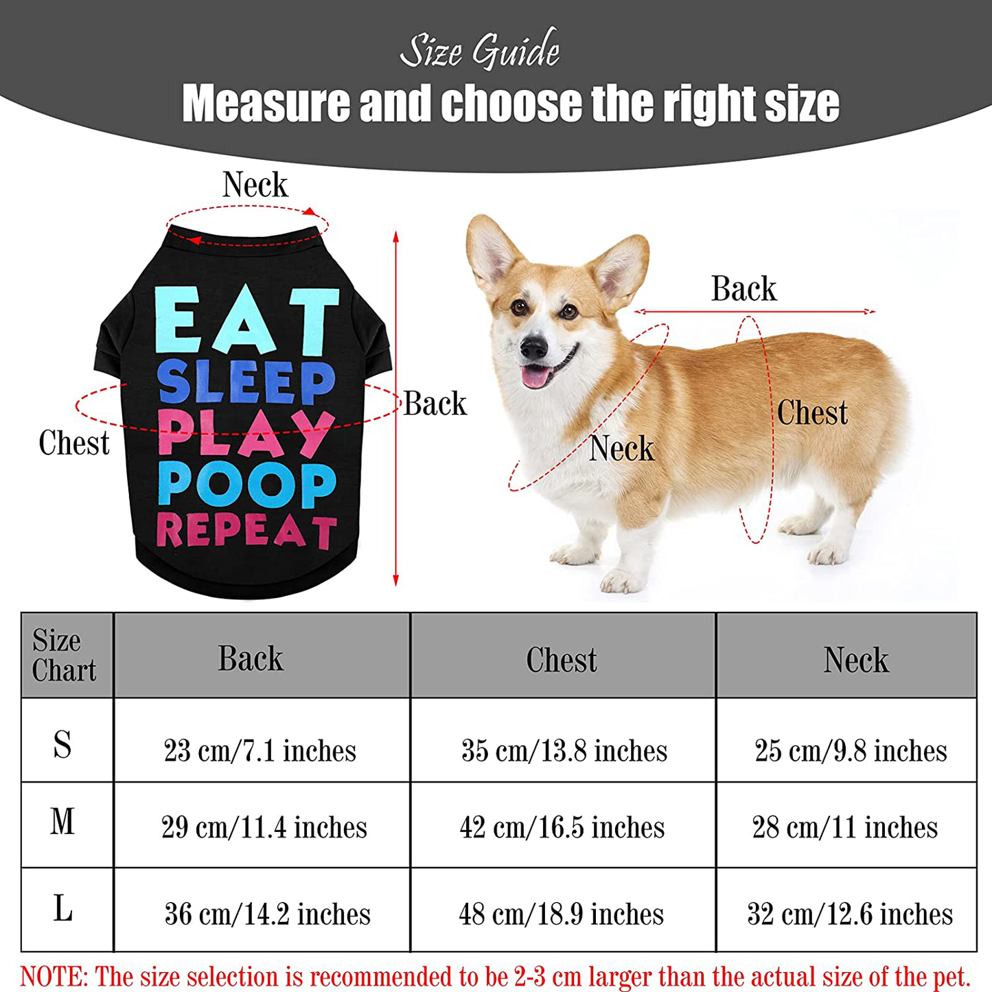 • Specific size: the size of our puppy shirt is L, which is 36 cm/14.2 inches in length, 48 cm/18.9 inches in chest circumference, 32 cm/12.6 inches in neck circumference; if the pet size is between 2 different sizes, please purchase the larger size and you can refer to the size table for other details