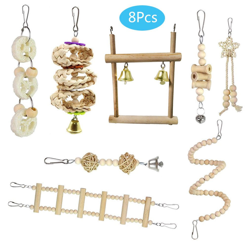 Package includes 8 different kids of bird toys, like Wood Spiral Ladders, bell toys, stand perch toys to meet your love bird's needs, entertaining toys arranged in multiple layers to climb, chew and explore. Birds will love bouncing around from toy to toy getting exercise.
