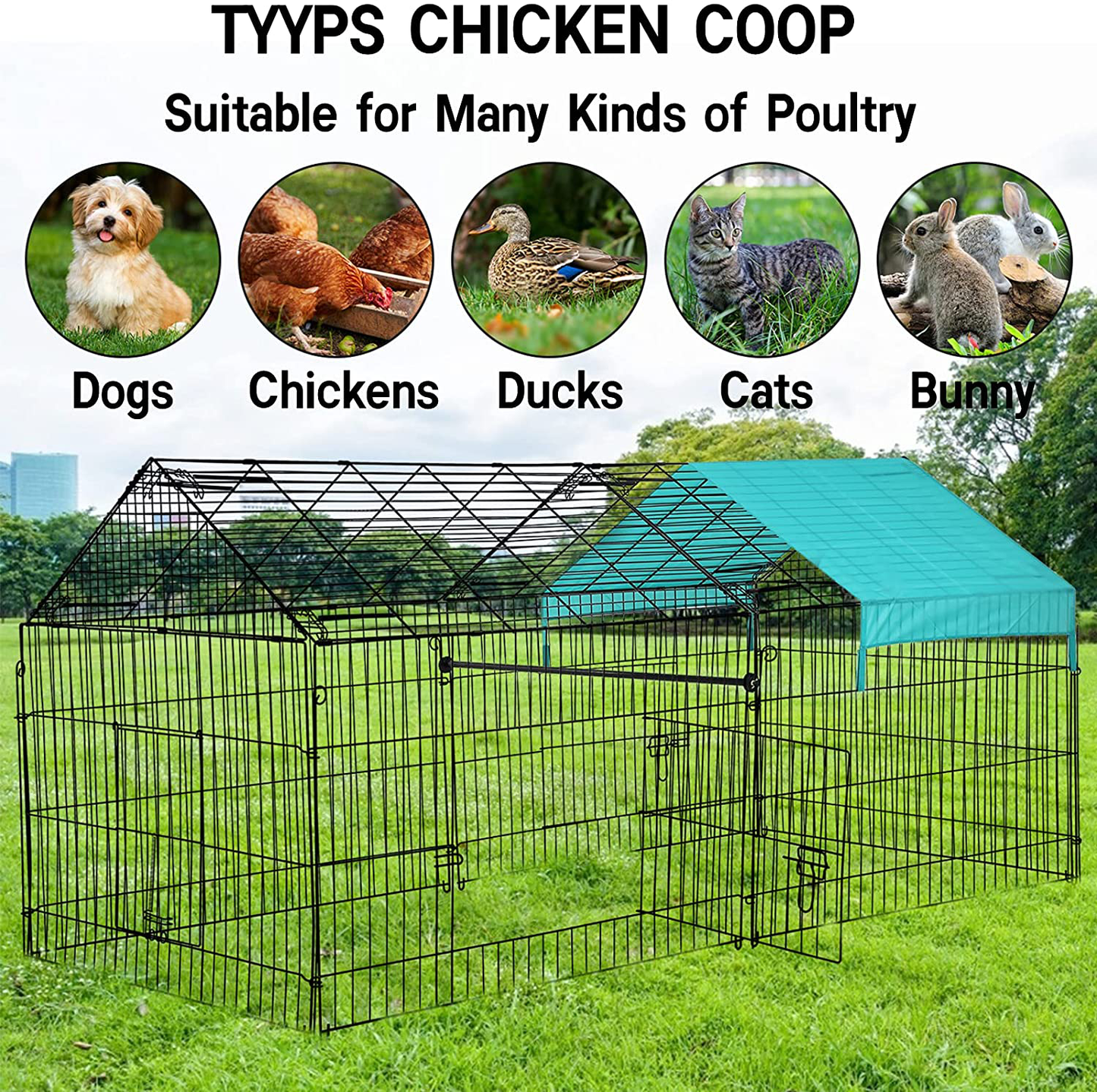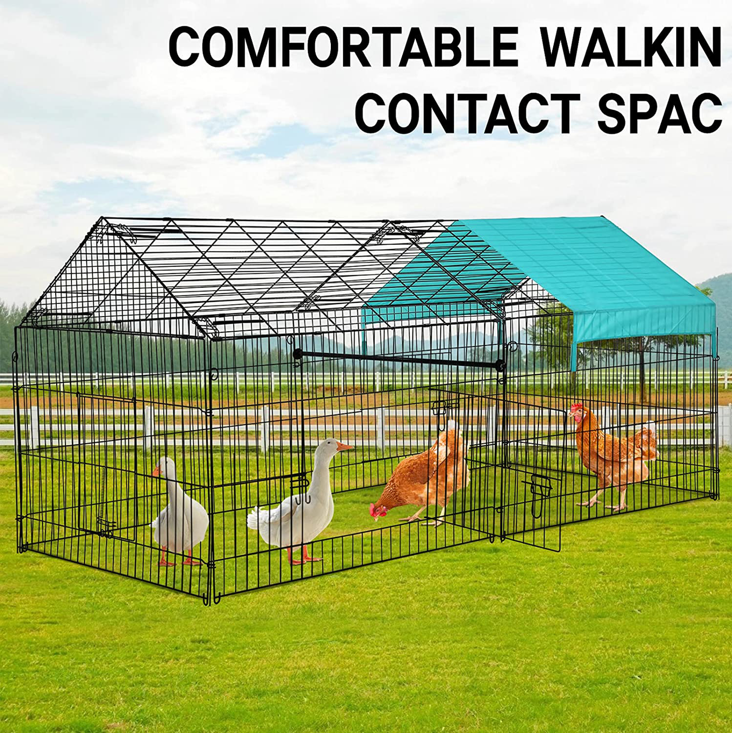 - 🐥【Sturdy and Durable Chicken Coop】This metal chicken coop is not only made of high quality steel frame, but also the surface coating is weather and rust resistant, which makes our chicken coop very strong and durable for long term use. The outdoor pet enclosure is made of high strength solid wire and the pet enclosure can be firmly fixed to the ground when used outdoors.