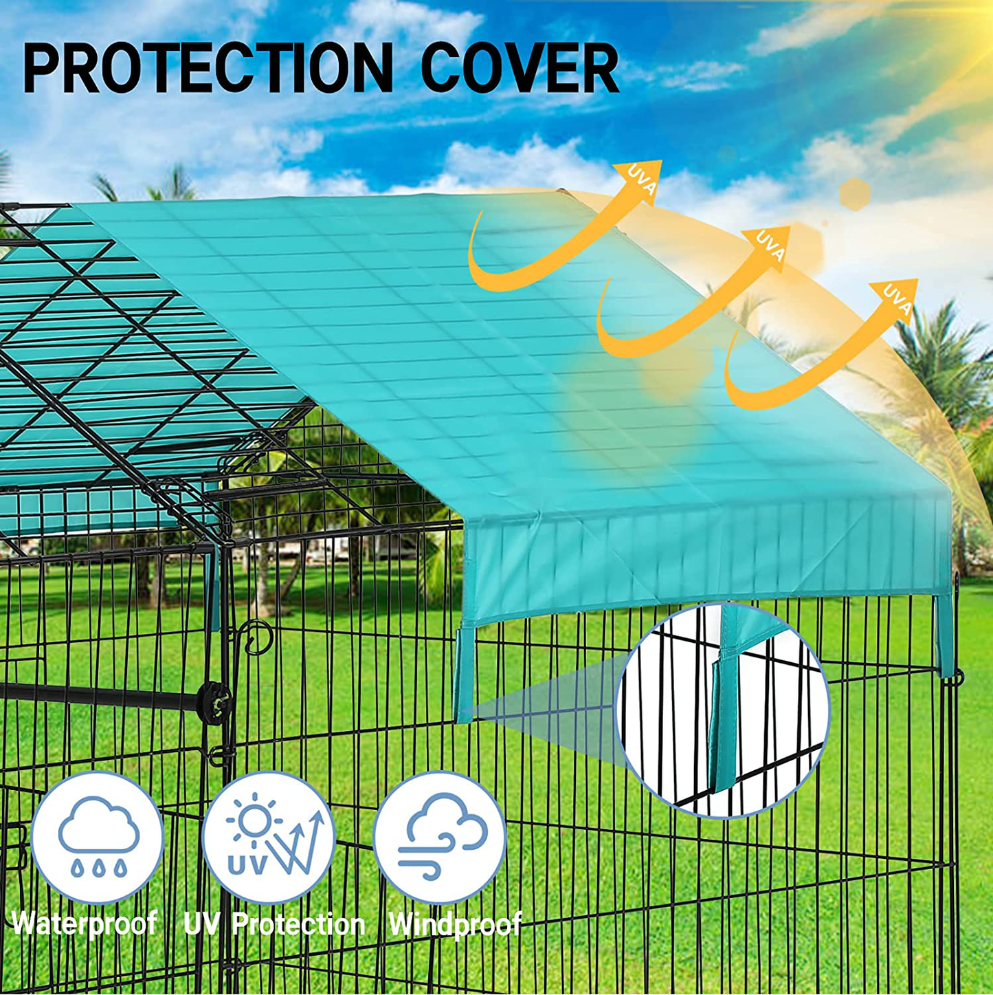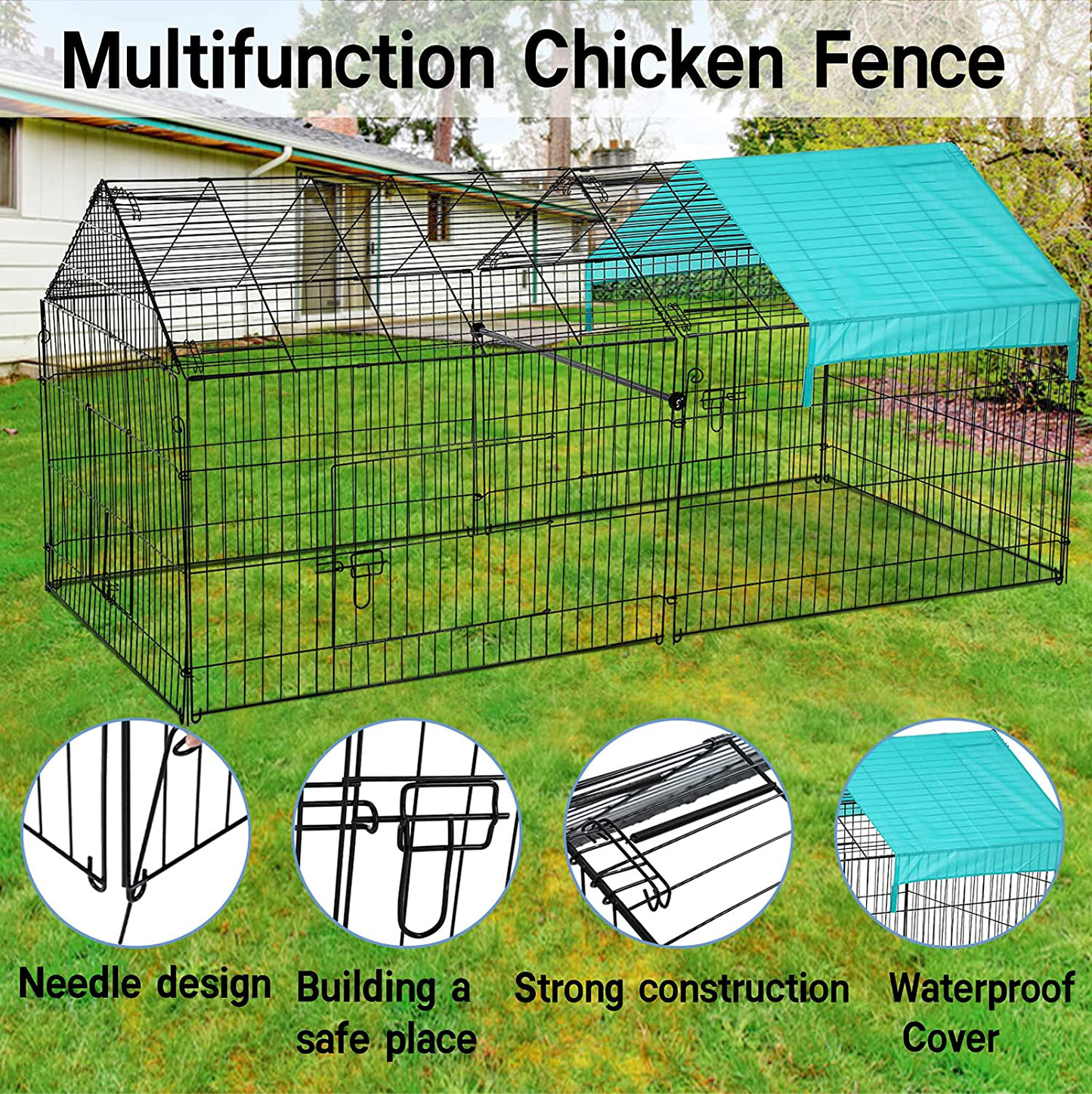 - 🐥【UV Protection & Waterproof Cover】Our chicken coop have durable UV and waterproof covers design to protect your chickens from the weather and the elements. The chicken fence is designed with an enclosed end to provide full protection for your pets from the sun, rain and snow while maintaining fresh air circulation, so you don't have to worry about the weather and can use it for a long time. And the slope design of the top of the chicken coop can prevent the accumulation of rain and snow.