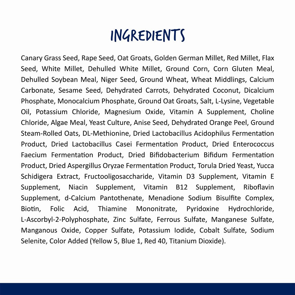 Vitakraft Menu Canary and Finch Food is a premium grain, fruit and nut bird seed mix that’s perfect for your small pet bird. This species-specific bird food provides complete nutrition thanks to a high-biodiversity mix that’s like a fiesta in a bag, including millet, canary grass seed, rape seed, oats, sesame, carrots, coconut, orange, and anise. Pair with fresh food, water, and lots of Vitakraft canary treats!