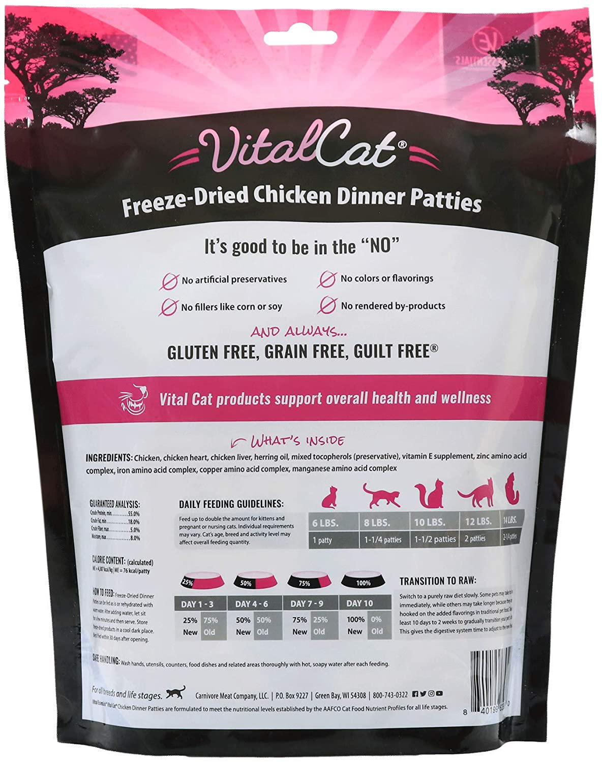 - CHICKEN DINNER PATTIES - Nothing but real chicken, organs and bones to satisfy their natural cravings. Great for all life stages from kitten to adult to mature.