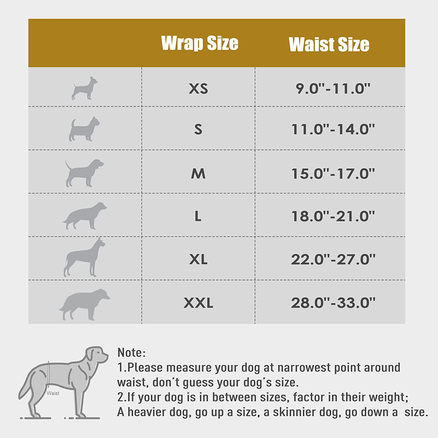 Since different brand size chart is a little different, please measure your dog's waist right in front of the back legs before ordering it, when measure your doggie, please loose 1"-2". When put it on, please adjust the hook & loop fastener to fit right size to make your dogs move freely.